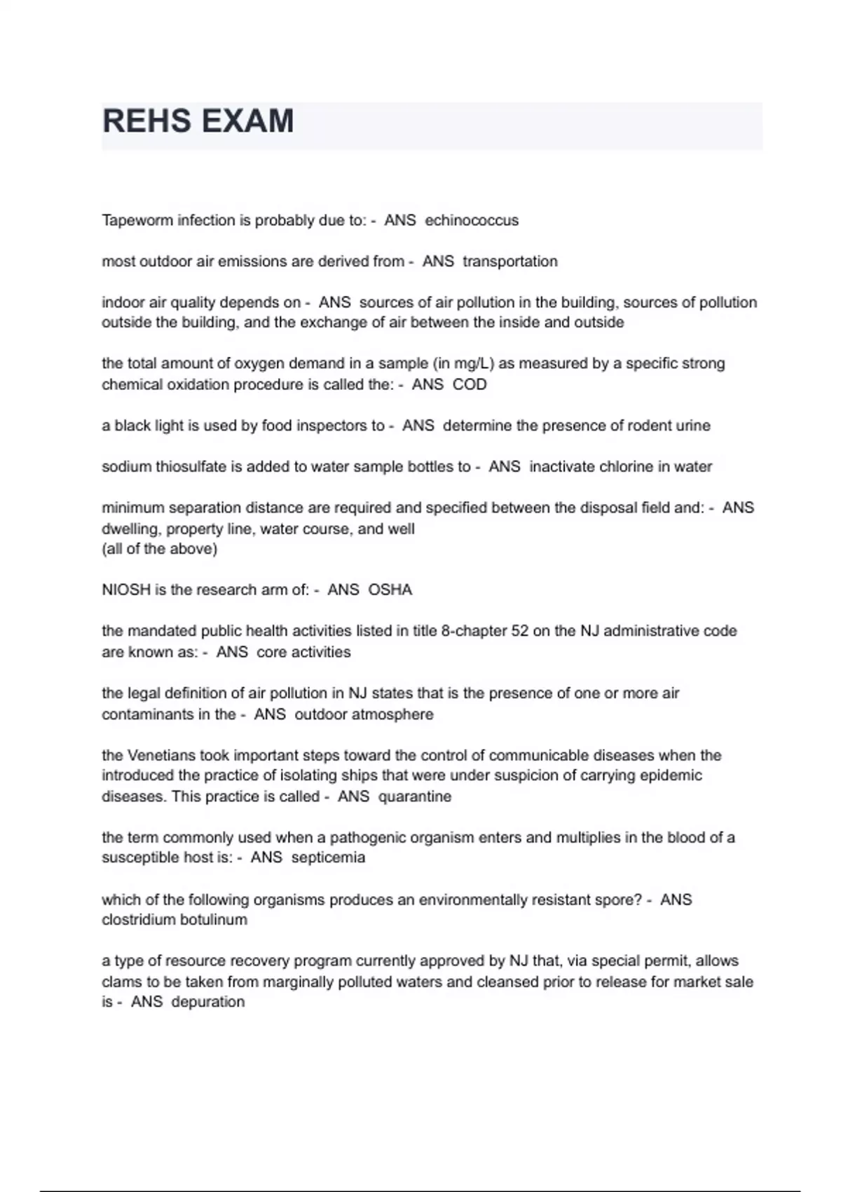 REHS EXAM QUESTIONS AND ANSWERS Tapeworm infection is probably due to: - ANS echinococcus most outdoor air emissions are derived from - ANS transportation indoor air quality depends on - ANS sources of air pollution in the building, sources of pollution outside the building, and the exchange of air between the inside and outside the total amount of oxygen demand in a sample (in mg/L) as measured by a specific strong chemical oxidation procedure is called the: - ANS COD a black light is used by food inspectors to - ANS determine the presence of rodent urine sodium thiosulfate is added to water sample bottles to - ANS inactivate chlorine in water minimum separation distance are required and specified between the disposal field and: - ANS dwelling, property line, water course, and well (all of the above) NIOSH is the research arm of: - ANS OSHA the mandated public health activities listed in title 8-chapter 52 on the NJ administrative code are known as: - ANS core activities the legal definition of air pollution in NJ states that is the presence of one or more air contaminants in the - ANS outdoor atmosphere the Venetians took important steps toward the control of communicable diseases when the introduced the practice of isolating ships that were under suspicion of carrying epidemic diseases. This practice is called - ANS quarantine the term commonly used when a pathogenic organism enters and multiplies in the blood of a susceptible host is: - ANS septicemia which of the following organisms produces an environmentally resistant spore? - ANS clostridium botulinum a type of resource recovery program currently approved by NJ that, via special permit, allows clams to be taken from marginally polluted waters and cleansed prior to release for market sale is - ANS depuration in taking a lab sample for water microbiology, you should: - ANS use a sterile container, take at least 100 ml for total coliform, keep the sample cold and have the sample analyzed within 30 hrs (all of the above) in collecting a water sample for volatile organic compounds, you need - ANS a 40ml glass vial with septum seal and an acid preservative in choosing a laboratory, health departments must make sure - ANS they are NJDEPE certified for the test you want performed good public health management requires - ANS intelligence, organizational behavior, human resources, firm knowledge in health and epidedemiology. (all of the above)