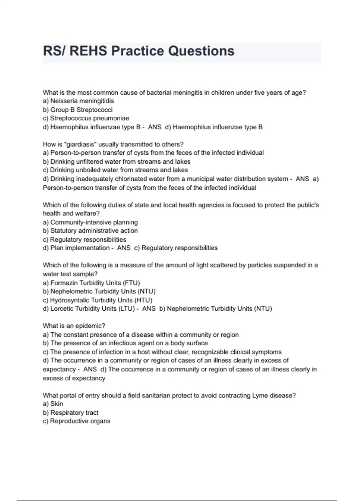 RS/ REHS Practice Questions And Answers What is the most common cause of bacterial meningitis in children under five years of age? a) Neisseria meningitidis b) Group B Streptococci c) Streptococcus pneumoniae d) Haemophilus influenzae type B - ANS d) Haemophilus influenzae type B How is "giardiasis" usually transmitted to others? a) Person-to-person transfer of cysts from the feces of the infected individual b) Drinking unfiltered water from streams and lakes c) Drinking unboiled water from streams and lakes d) Drinking inadequately chlorinated water from a municipal water distribution system - ANS a) Person-to-person transfer of cysts from the feces of the infected individual Which of the following duties of state and local health agencies is focused to protect the public's health and welfare? a) Community-intensive planning b) Statutory administrative action c) Regulatory responsibilities d) Plan implementation - ANS c) Regulatory responsibilities Which of the following is a measure of the amount of light scattered by particles suspended in a water test sample? a) Formazin Turbidity Units (FTU) b) Nephelometric Turbidity Units (NTU) c) Hydrosyntalic Turbidity Units (HTU) d) Lorcetic Turbidity Units (LTU) - ANS b) Nephelometric Turbidity Units (NTU) What is an epidemic? a) The constant presence of a disease within a community or region b) The presence of an infectious agent on a body surface c) The presence of infection in a host without clear