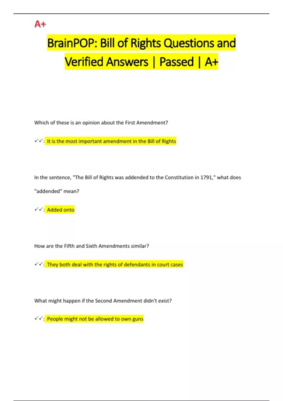 BrainPOP: Bill of Rights Questions and Verified Answers | Passed | A+