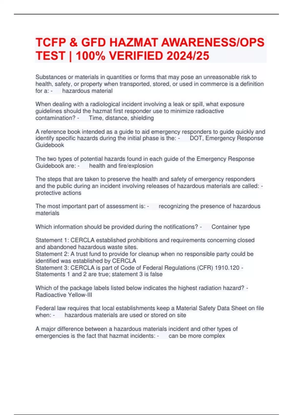 TCFP & GFD HAZMAT AWARENESS/OPS TEST | 100% VERIFIED 2024/25