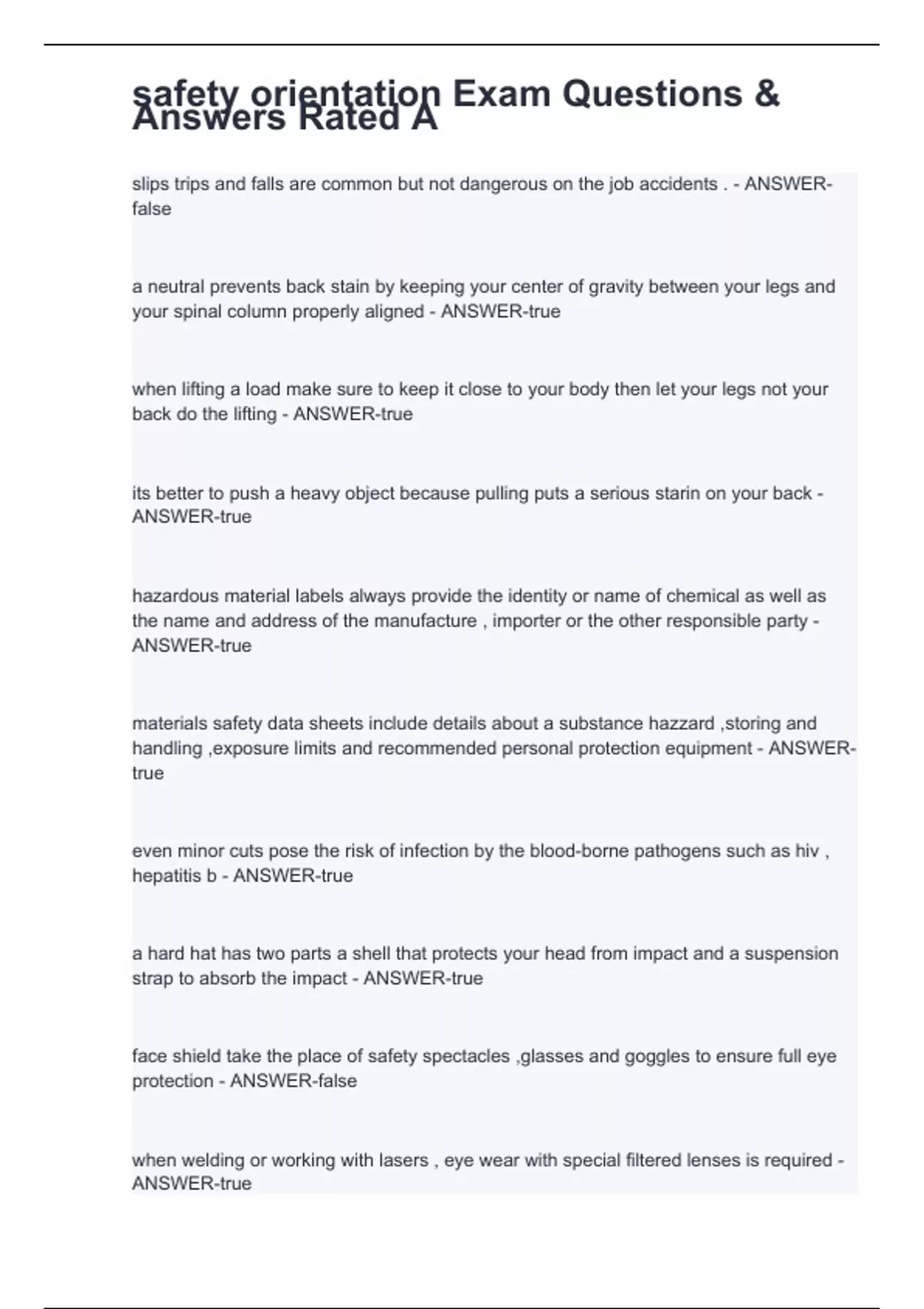 slips trips and falls are common but not dangerous on the job accidents . - ANSWER-false a neutral prevents back stain by keeping your center of gravity between your legs and your spinal column properly aligned - ANSWER-true when lifting a load make sure to keep it close to your body then let your legs not your back do the lifting - ANSWER-true its better to push a heavy object because pulling puts a serious starin on your back - ANSWER-true hazardous material labels always provide the identity or name of chemical as well as the name and address of the manufacture , importer or the other responsible party - ANSWER-true materials safety data sheets include details about a substance hazzard ,storing and handling ,exposure limits and recommended personal protection equipment - ANSWER-true even minor cuts pose the risk of infection by the blood-borne pathogens such as hiv , hepatitis b - ANSWER-true a hard hat has two parts a shell that protects your head from impact and a suspension strap to absorb the impact - ANSWER-true face shield take the place of safety spectacles ,glasses and goggles to ensure full eye protection - ANSWER-false