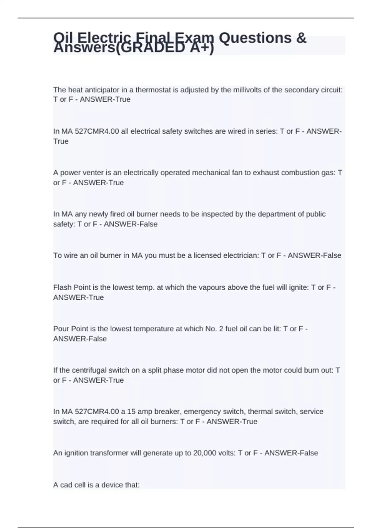 The heat anticipator in a thermostat is adjusted by the millivolts of the secondary circuit: T or F - ANSWER-True In MA 527CMR4.00 all electrical safety switches are wired in series: T or F - ANSWER-True A power venter is an electrically operated mechanical fan to exhaust combustion gas: T or F - ANSWER-True In MA any newly fired oil burner needs to be inspected by the department of public safety: T or F - ANSWER-False To wire an oil burner in MA you must be a licensed electrician: T or F - ANSWER-False Flash Point is the lowest temp. at which the vapours above the fuel will ignite: T or F - ANSWER-True Pour Point is the lowest temperature at which No. 2 fuel oil can be lit: T or F - ANSWER-False If the centrifugal switch on a split phase motor did not open the motor could burn out: T or F - ANSWER-True In MA 527CMR4.00 a 15 amp breaker, emergency switch, thermal switch, service switch, are required for all oil burners: T or F - ANSWER-True An ignition transformer will generate up to 20,000 volts: T or F - ANSWER-False
