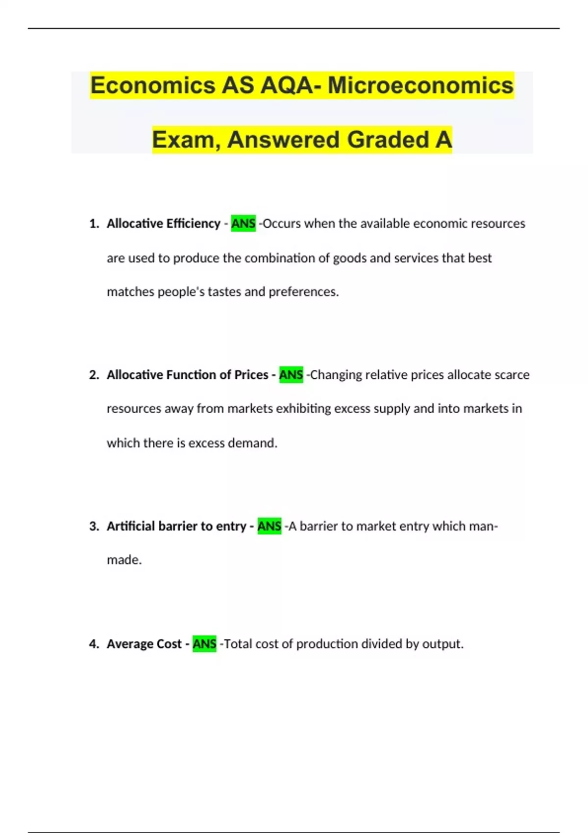 Economics AS AQA- Microeconomics Exam, Answered Graded A