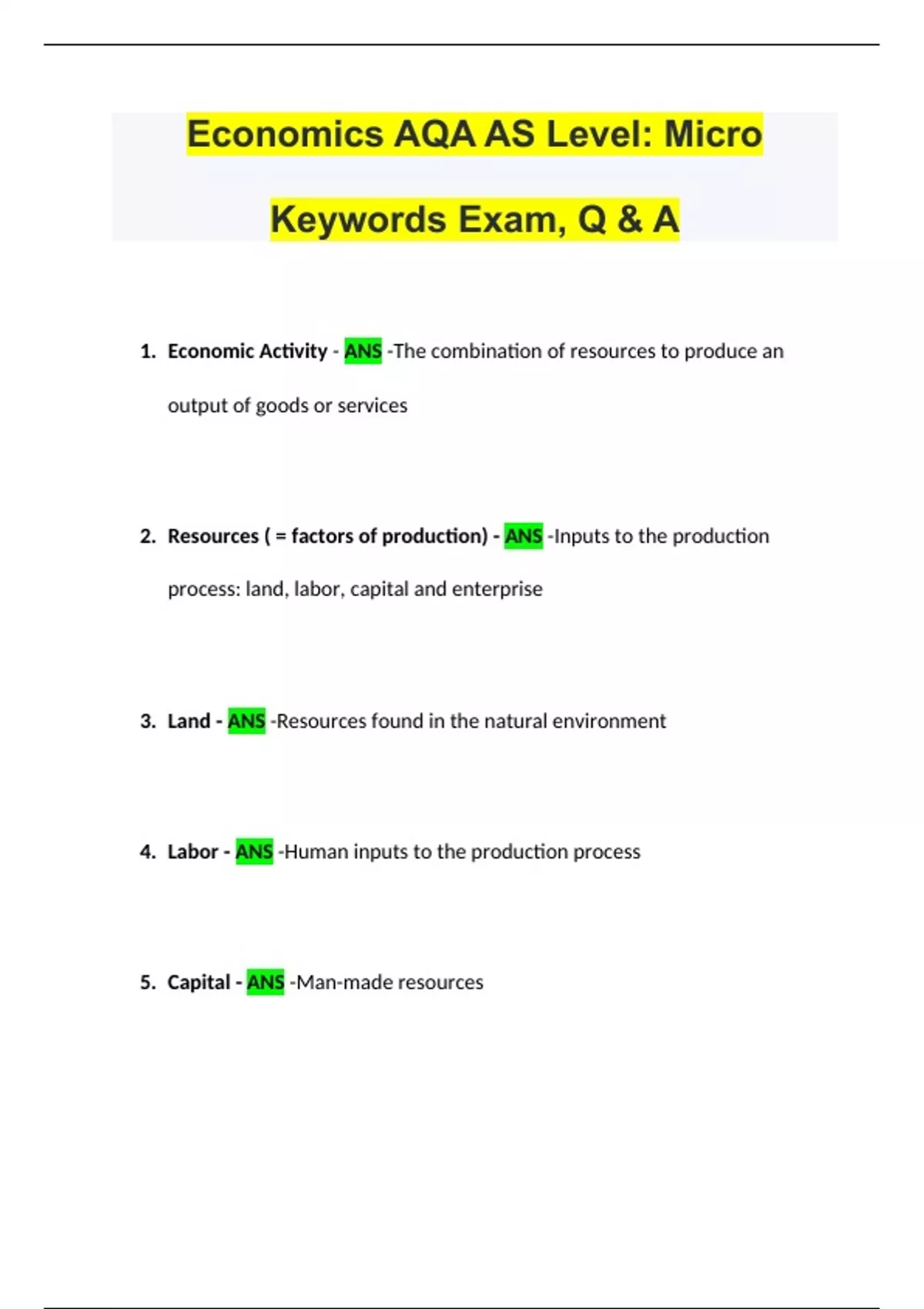 Economics AQA AS Level: Micro Keywords Exam, Q & A