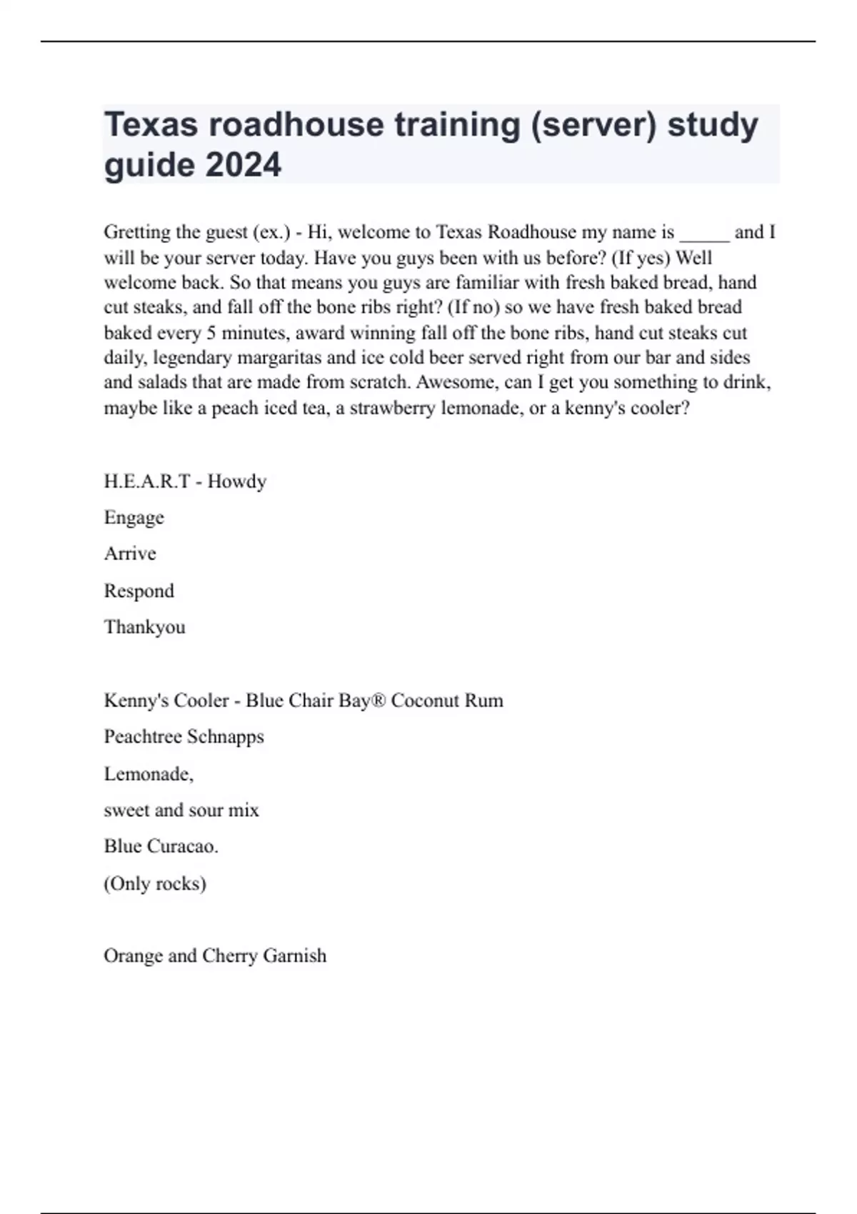 Gretting the guest (ex.) - Hi, welcome to Texas Roadhouse my name is _____ and I will be your server today. Have you guys been with us before? (If yes) Well welcome back. So that means you guys are familiar with fresh baked bread, hand cut steaks, and fall off the bone ribs right? (If no) so we have fresh baked bread baked every 5 minutes, award winning fall off the bone ribs, hand cut steaks cut daily, legendary margaritas and ice cold beer served right from our bar and sides and salads that are made from scratch. Awesome, can I get you something to drink, maybe like a peach iced tea, a strawberry lemonade, or a kenny's cooler? H.E.A.R.T - Howdy Engage Arrive Respond Thankyou Kenny's Cooler - Blue Chair Bay® Coconut Rum Peachtree Schnapps Lemonade, sweet and sour mix Blue Curacao. (Only rocks) Orange and Cherry Garnish Hurricane Margarita - Rocks or Frozen Original margarita blended with Captain Morgan grenadine orange juice pineapple juice Orange and cherry Garnish Jamaican Cowboy - Rocks or Frozen Malibu Peachtree Schnapps orange juice pineapple juice Original Margarita Orange Garnish Sangria - Blend of red wines fruit juices triple sec brandy Texas Peach Fuzz - Absolut® Vodka