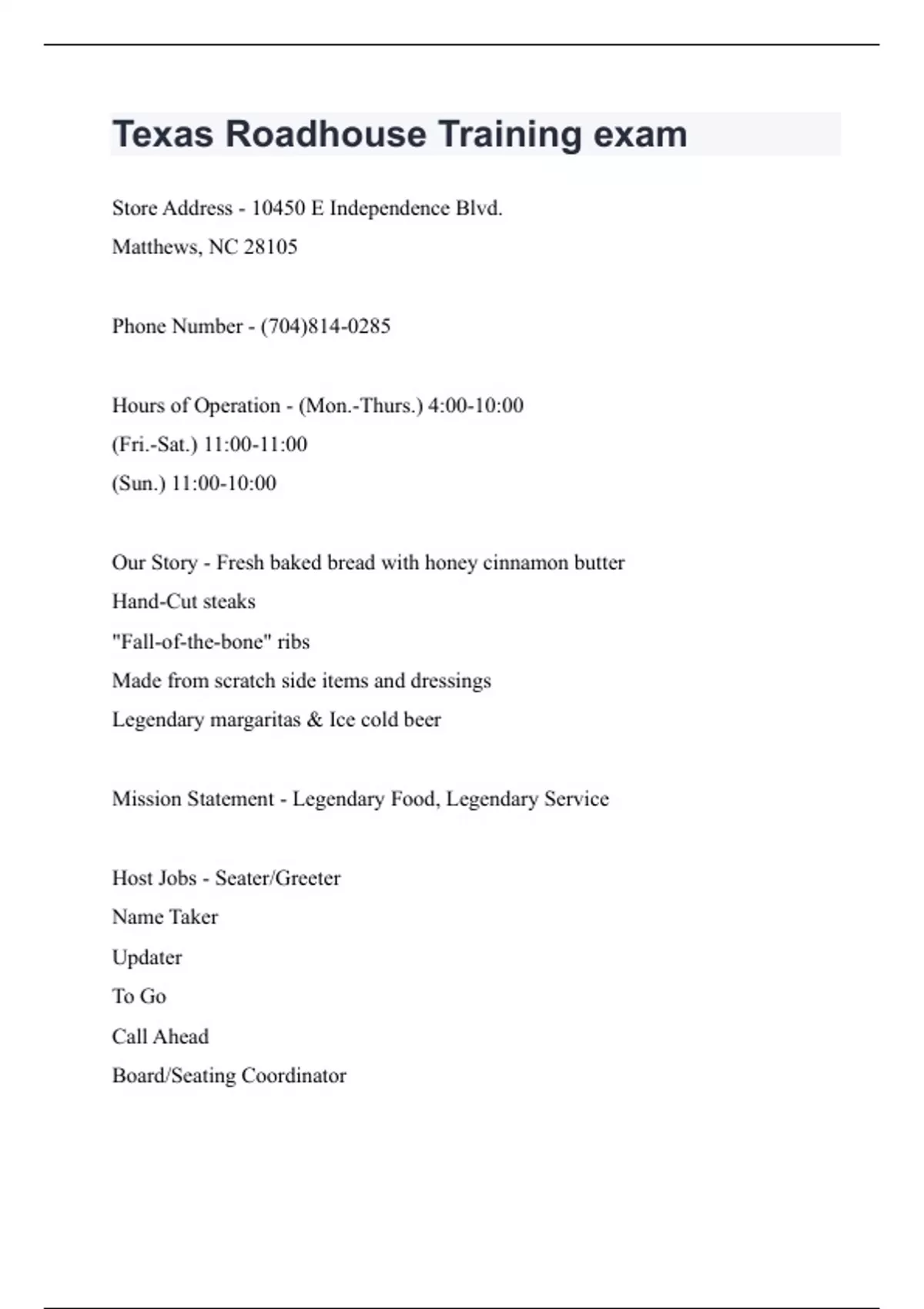Store Address - 10450 E Independence Blvd. Matthews, NC 28105 Phone Number - (704)814-0285 Hours of Operation - (Mon.-Thurs.) 4:00-10:00 (Fri.-Sat.) 11:00-11:00 (Sun.) 11:00-10:00 Our Story - Fresh baked bread with honey cinnamon butter Hand-Cut steaks "Fall-of-the-bone" ribs Made from scratch side items and dressings Legendary margaritas & Ice cold beer Mission Statement - Legendary Food, Legendary Service Host Jobs - Seater/Greeter Name Taker Updater To Go Call Ahead Board/Seating Coordinator Large Party Coordinator Door Coordinator Seater/Greeter - Open door for arriving/departing guests Give a friendly greeting and heartfelt thanks, inviting guests to come back soon Seat guests with bread, initiates conversation and the story while leading the to the table