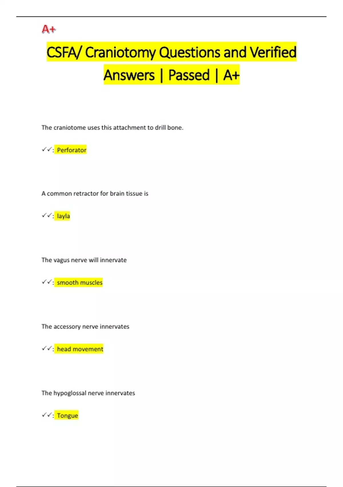 CSFA/ Craniotomy Questions and Verified Answers | Passed | A+