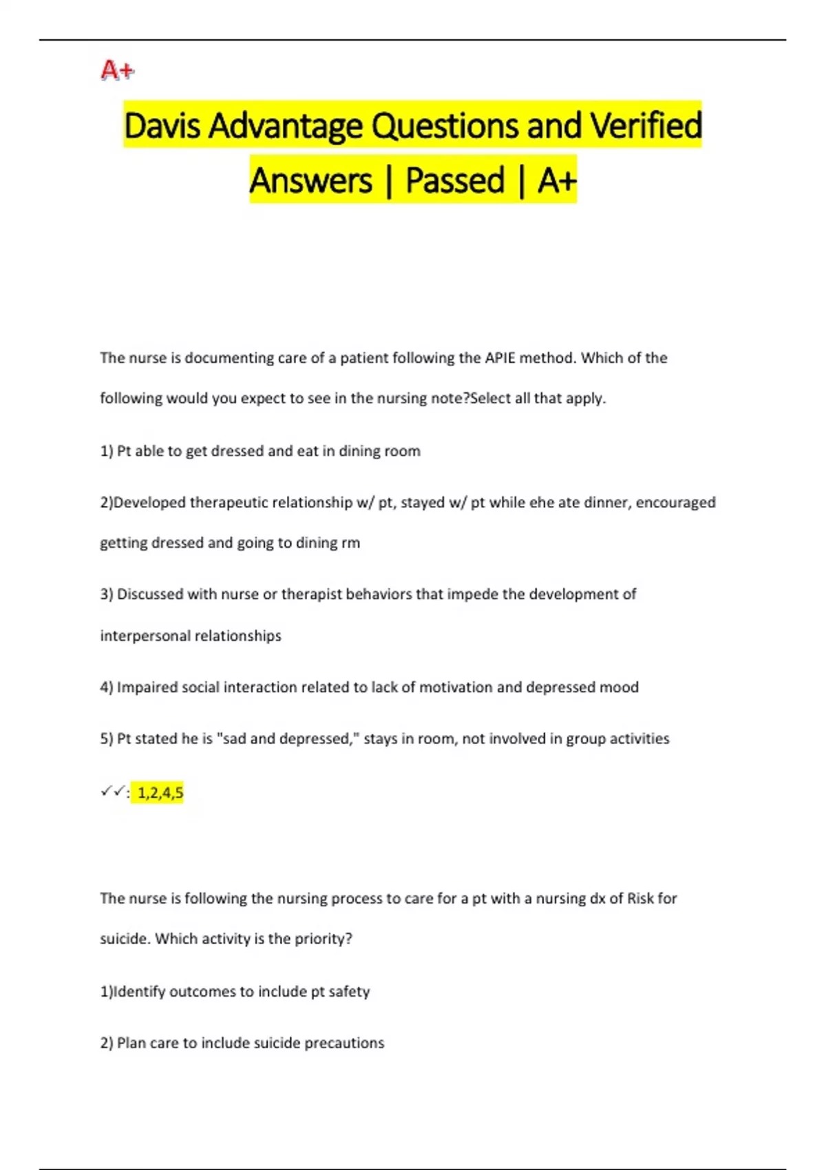 The nurse is documenting care of a patient following the APIE method. Which of the following would you expect to see in the nursing note?Select all that apply. 1) Pt able to get dressed and eat in dining room 2)Developed therapeutic relationship w/ pt, stayed w/ pt while ehe ate dinner, encouraged getting dressed and going to dining rm 3) Discussed with nurse or therapist behaviors that impede the development of interpersonal relationships 4) Impaired social interaction related to lack of motivation and depressed mood 5) Pt stated he is "sad and depressed," stays in room, not involved in group activities : 1,2,4,5 The nurse is following the nursing process to care for a pt with a nursing dx of Risk for suicide. Which activity is the priority? 1)Identify outcomes to include pt safety 2) Plan care to include suicide precautions 2 3) Assess for suicidal ideation 4) Maintain safe and therapeutic environme