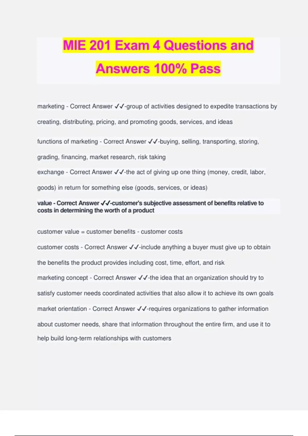 MIE 201 Exam 4 Questions and Answers 100% Pass marketing - Correct Answer ️️ -group of activities designed to expedite transactions by creating, distributing, pricing, and promoting goods, services, and ideas functions of marketing - Correct Answer ️️ -buying, selling, transporting, storing, grading, financing, market research, risk taking exchange - Correct Answer ️️ -the act of giving up one thing (money, credit, labor, goods) in return for something else (goods, services, or ideas) value - Correct Answer ️️ -customer's subjective assessment of benefits relative to costs in determining the worth of a product customer value = customer benefits - customer costs customer costs - Correct Answer ️️ -include anything a buyer must give up to obtain the benefits the product provides including cost, time, effort, and risk marketing concept - Correct Answer ️️ -the idea that an organization should try to satisfy customer needs coordinated activities that also allow it to achieve its own goals market orientation - Correct Answer ️️ -requires organizations to gather information about customer needs, share that information throughout the entire firm, and use it to help build long-term relationships with customers must first determine what customers want and then produce it, rather than making the products first and then trying to persuade customers that they need them production orientation - Correct Answer ️️ -New technologies, such as electricity, railroads, internal combustion engines, and mass-production techniques, made it possible to manufacture goods with ever increasing efficiency Together with new management ideas and ways of using labor, products poured into the marketplace, where demand for manufactured goods was strong. sales orientation - Correct Answer ️️ -businesspeople viewed sales as the primary means of increasing profits those who adopted the sales orientation perspective believed the most important marketing activities were personal selling and advertising marketing strategy - Correct Answer ️️ -a plan of action for developing, pricing, distributing, and promoting products that meet the needs of specific customers market - Correct Answer ️️ -a group of people who have a need, purchasing power, and the desire and authority to spend money on goods, services, and ideas target market - Correct Answer ️️ -more specific group of consumers on whose needs and wants a company focuses its marketing efforts. Target markets can be further segmented into business markets and consumer markets Business-to-business (B2B) - Correct Answer ️️ -involves marketing products to customers who will use the product for resale, direct use in daily operations, or direct use in making other products Business-to-consumer (B2C) - Correct Answer ️️ -marketing directly to the end consumer total-market approach - Correct Answer ️️ -firms try to appeal to everyone and assume that all buyers have similar needs and wants market segmentation - Correct Answer ️️ -divide the total market into groups of people market segment - Correct Answer ️️ -collection of individuals, groups, or organizations who share one or more characteristics and thus have relatively similar product needs and desires concentration approach - Correct Answer ️️ -a company develops one marketing strategy for a single market segment the concentration approach allows a firm to specialize, focusing all its eff