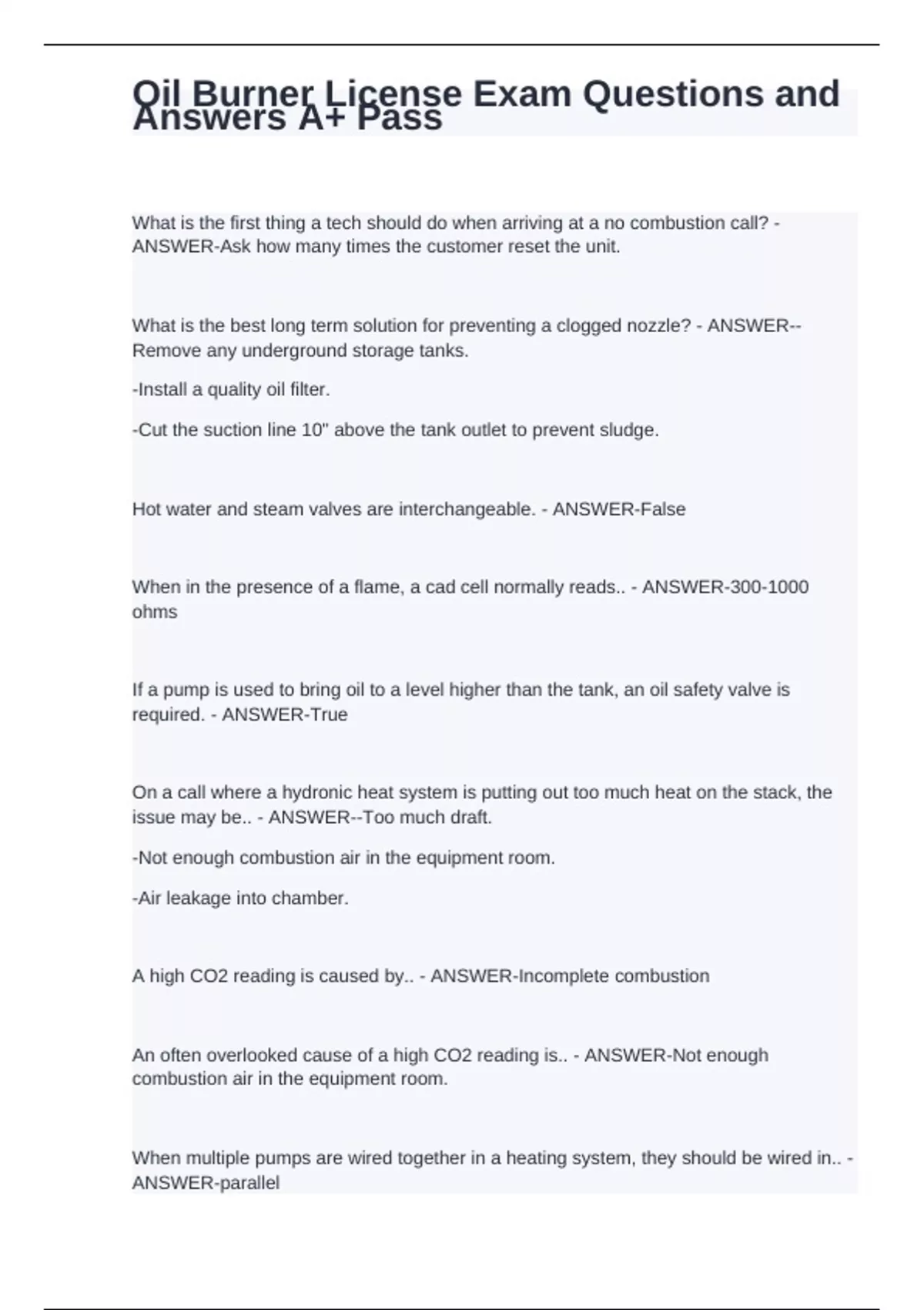 What is the first thing a tech should do when arriving at a no combustion call? - ANSWER-Ask how many times the customer reset the unit. What is the best long term solution for preventing a clogged nozzle? - ANSWER--Remove any underground storage tanks. -Install a quality oil filter. -Cut the suction line 10" above the tank outlet to prevent sludge. Hot water and steam valves are interchangeable. - ANSWER-False When in the presence of a flame, a cad cell normally reads.. - ANSWER-300-1000 ohms If a pump is used to bring oil to a level higher than the tank, an oil safety valve is required. - ANSWER-True On a call where a hydronic heat system is putting out too much heat on the stack, the issue may be.. - ANSWER--Too much draft. -Not enough combustion air in the equipment room. -Air leakage into chamber. A high CO2 reading is caused by.. - ANSWER-Incomplete combustion An often overlooked cause of a high CO2 reading is.. - ANSWER-Not enough combustion air in the equipment room. When multiple pumps are wired together in a heating system, they should be wired in.. - ANSWER-parallel In a series circuit.. - ANSWER-Current has one path. When 2 burners are connected to the same chimney.. - ANSWER-Sufficient draft must be obtained to operate both units. The ignition transformer is located.. - ANSWER-In the primary control.
