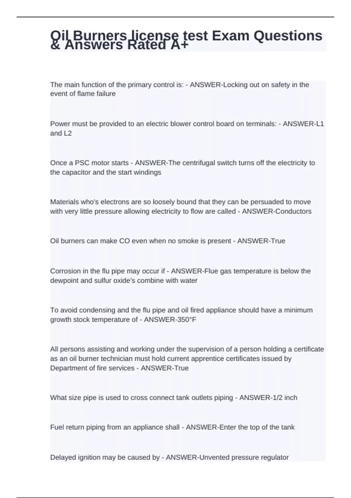 The main function of the primary control is: - ANSWER-Locking out on safety in the event of flame failure Power must be provided to an electric blower control board on terminals: - ANSWER-L1 and L2 Once a PSC motor starts - ANSWER-The centrifugal switch turns off the electricity to the capacitor and the start windings Materials who's electrons are so loosely bound that they can be persuaded to move with very little pressure allowing electricity to flow are called - ANSWER-Conductors Oil burners can make CO even when no smoke is present - ANSWER-True Corrosion in the flu pipe may occur if - ANSWER-Flue gas temperature is below the dewpoint and sulfur oxide's combine with water To avoid condensing and the flu pipe and oil fired appliance should have a minimum growth stock temperature of - ANSWER-350°F All persons assisting and working under the supervision of a person holding a certificate as an oil burner technician must hold current apprentice certificates issued by Department of fire services - ANSWER-True What size pipe is used to cross connect tank outlets piping - ANSWER-1/2 inch Fuel return piping from an appliance shall - ANSWER-Enter the top of the tank