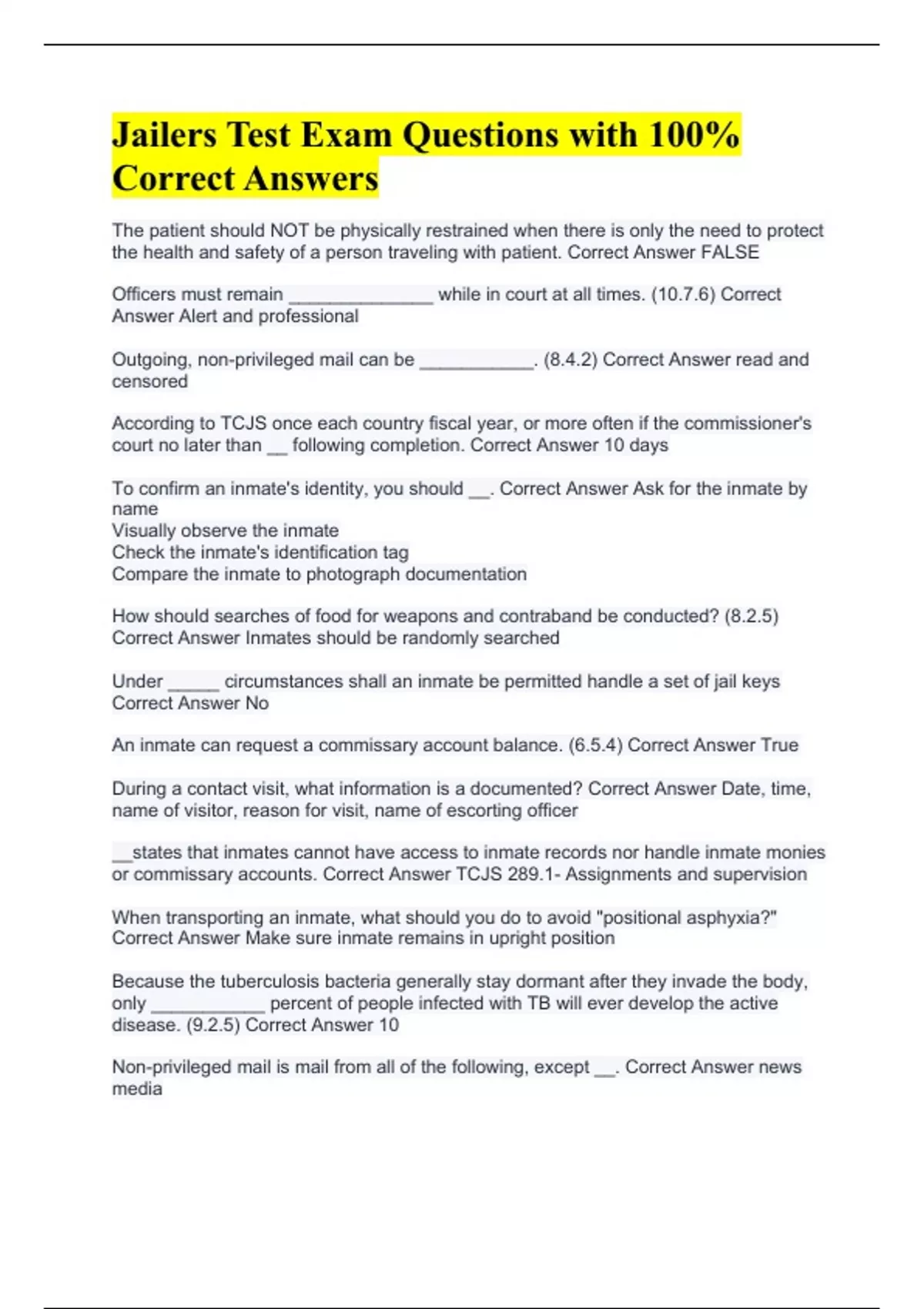 The patient should NOT be physically restrained when there is only the need to protect the health and safety of a person traveling with patient. Correct Answer FALSE Officers must remain ______________ while in court at all times. (10.7.6) Correct Answer Alert and professional Outgoing, non-privileged mail can be ___________. (8.4.2) Correct Answer read and censored According to TCJS once each country fiscal year, or more often if the commissioner's court no later than __ following completion. Correct Answer 10 days To confirm an inmate's identity, you should __. Correct Answer Ask for the inmate by name Visually observe the inmate Check the inmate's identification tag Compare the inmate to photograph documentation How should searches of food for weapons and contraband be conducted? (8.2.5) Correct Answer Inmates should be randomly searched Under _____ circumstances shall an inmate be permitted handle a set of jail keys Correct Answer No An inmate can request a commissary account balance. (6.5.4) Correct Answer True During a contact visit, what information is a documented? Correct Answer Date, time, name of visitor, reason for visit, name of escorting officer __states that inmates cannot have access to inmate records nor handle inmate monies or commissary accounts. Correct Answer TCJS 289.1- Assignments and supervision When transporting an inmate, what should you do to avoid "positional asphyxia?" Correct Answer Make sure inmate remains in upright position Because the tuberculosis bacteria generally stay dormant after they invade the body, only ___________ percent of people infected with TB will ever develop the active disease. (9.2.5) Correct Answer 10 Non-privileged mail is mail from all of the following, except __. Correct Answer news media