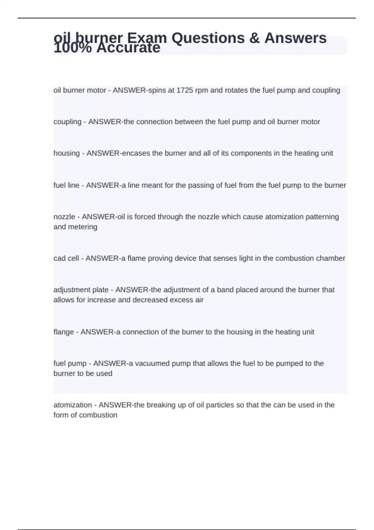 oil burner motor - ANSWER-spins at 1725 rpm and rotates the fuel pump and coupling coupling - ANSWER-the connection between the fuel pump and oil burner motor housing - ANSWER-encases the burner and all of its components in the heating unit fuel line - ANSWER-a line meant for the passing of fuel from the fuel pump to the burner nozzle - ANSWER-oil is forced through the nozzle which cause atomization patterning and metering cad cell - ANSWER-a flame proving device that senses light in the combustion chamber adjustment plate - ANSWER-the adjustment of a band placed around the burner that allows for increase and decreased excess air flange - ANSWER-a connection of the burner to the housing in the heating unit fuel pump - ANSWER-a vacuumed pump that allows the fuel to be pumped to the burner to be used atomization - ANSWER-the breaking up of oil particles so that the can be used in the form of combustion