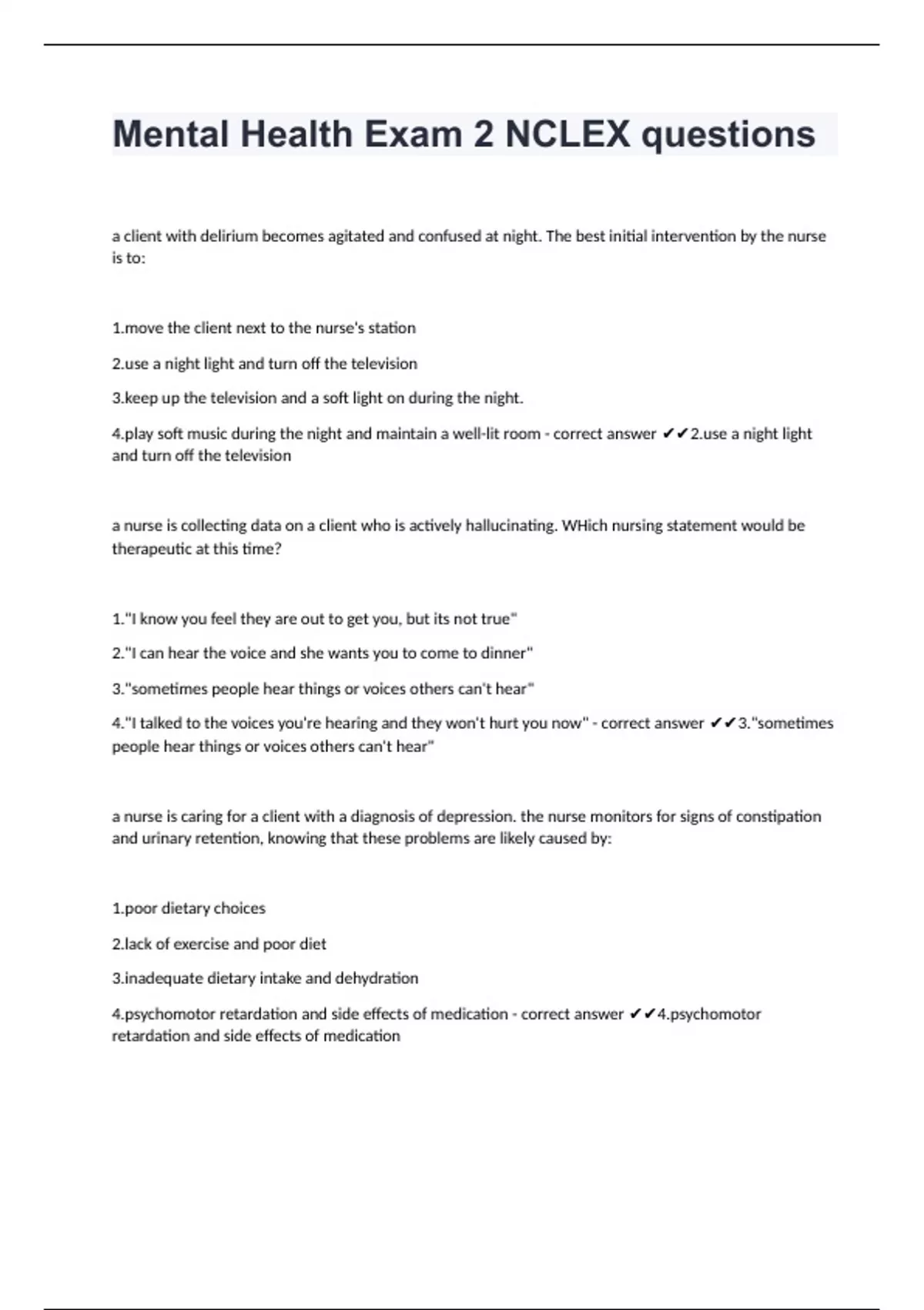 Mental Health Exam 2 NCLEX questionsa client with delirium becomes agitated and confused at night. The best initial intervention by the nurse is to: the client next to the nurse's station a night light and turn off the television up the television and a soft light on during the night. soft music during the night and maintain a well-lit room - correct answer a night light and turn off the television a nurse is collecting data on a client who is actively hallucinating. WHich nursing statement would be therapeutic at this time? 1."I know you feel they are out to get you, but its not true" 2."I can hear the voice and she wants you to come to dinner" 3."sometimes people hear things or voices others can't hear" 4."I talked to the voices you're hearing and they won't hurt you now" - correct answer 3."sometimes people hear things or voices others can't hear" a nurse is caring for a client with a diagnosis of depression. the nurse monitors for signs of constipation and urinary retention, knowing that these problems are likely caused by: dietary choices of exercise and poor diet quate dietary intake and dehydration omotor retardation and side effects of medication - correct answer omotor retardation and side effects of medication