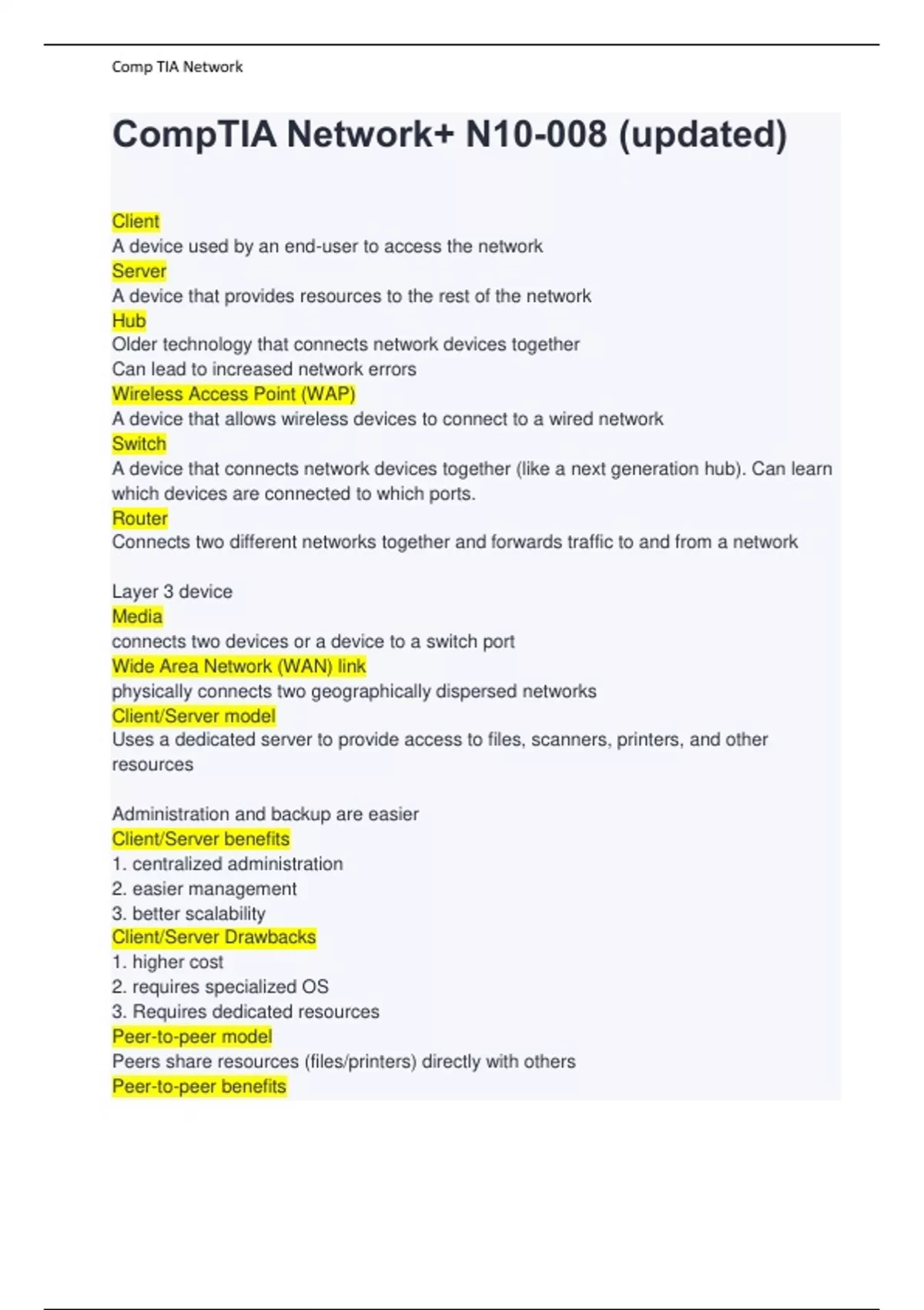 CompTIA Network+ N10-008 (updated) Client A device used by an end-user to access the network Server A device that provides resources to the rest of the network Hub Older technology that connects network devices together Can lead to increased network errors Wireless Access Point (WAP) A device that allows wireless devices to connect to a wired network Switch A device that connects network devices together (like a next generation hub). Can learn which devices are connected to which ports. Router Connects two different networks together and forwards traffic to and from a network Layer 3 device Media connects two devices or a device to a switch port Wide Area Network (WAN) link physically connects two geographically dispersed networks Client/Server model Uses a dedicated server to provide access to files, scanners, printers, and other resources Administration and backup are easier Client/Server benefits 1. centralized administration 2. easier management 3. better scalability Client/Server Drawbacks 1. higher cost 2. requires specialized OS 3. Requires dedicated resources Peer-to-peer model Peers share resources (files/printers) directly with others Peer-to-peer benefits
