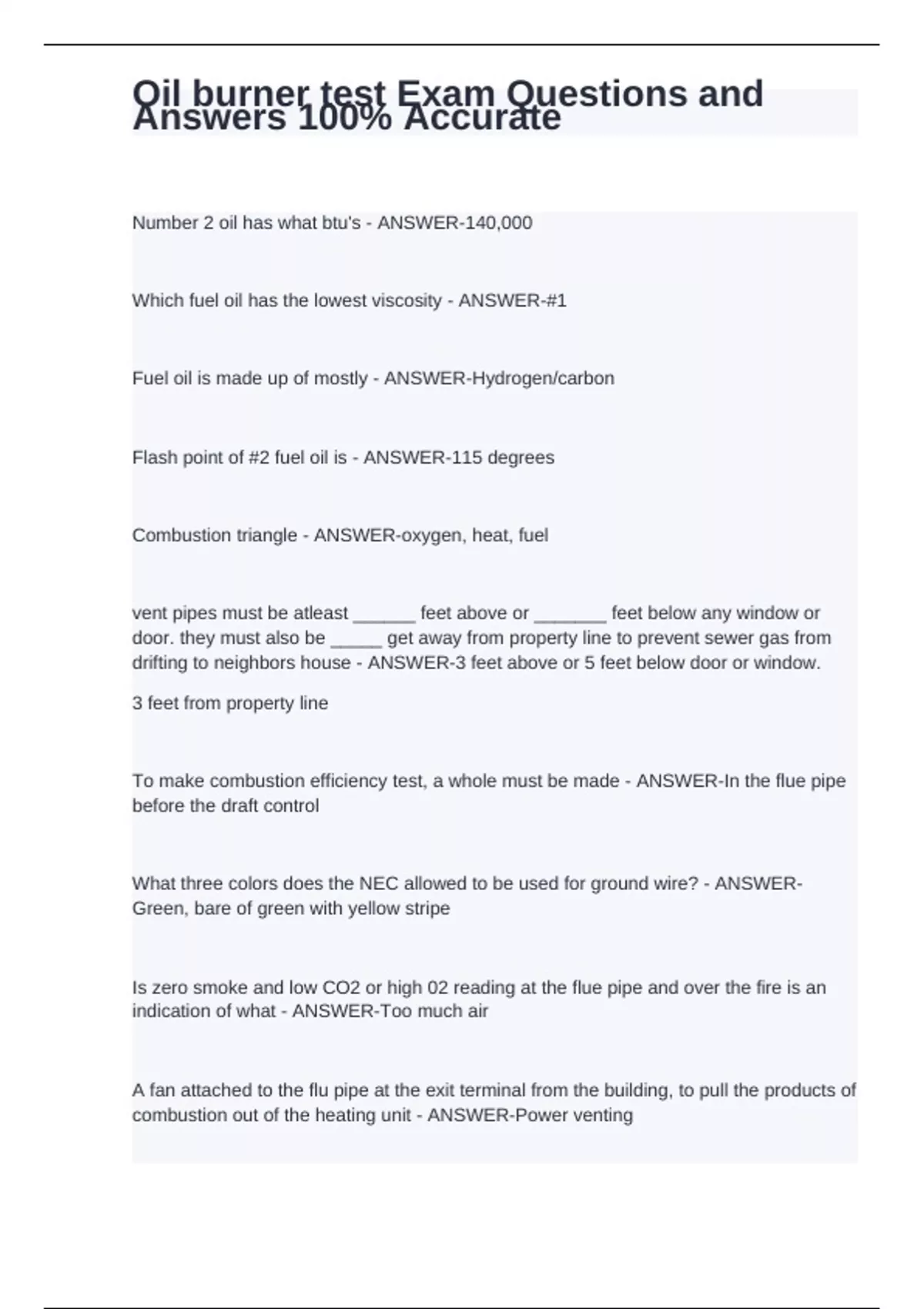 Number 2 oil has what btu's - ANSWER-140,000 Which fuel oil has the lowest viscosity - ANSWER-#1 Fuel oil is made up of mostly - ANSWER-Hydrogen/carbon Flash point of #2 fuel oil is - ANSWER-115 degrees Combustion triangle - ANSWER-oxygen, heat, fuel vent pipes must be atleast ______ feet above or _______ feet below any window or door. they must also be _____ get away from property line to prevent sewer gas from drifting to neighbors house - ANSWER-3 feet above or 5 feet below door or window. 3 feet from property line To make combustion efficiency test, a whole must be made - ANSWER-In the flue pipe before the draft control What three colors does the NEC allowed to be used for ground wire? - ANSWER-Green, bare of green with yellow stripe Is zero smoke and low CO2 or high 02 reading at the flue pipe and over the fire is an indication of what - ANSWER-Too much air A fan attached to the flu pipe at the exit terminal from the building, to pull the products of combustion out of the heating unit - ANSWER-Power venting Static pressure created by the burner fan, pushes the combustion gases through the heat exchanger and out of the building - ANSWER-Direct venting Expansion tanks are needed, and what type of system - ANSWER-Hot water A direct vented boiler is a positive pressure system, and no chimney is needed - ANSWER-True