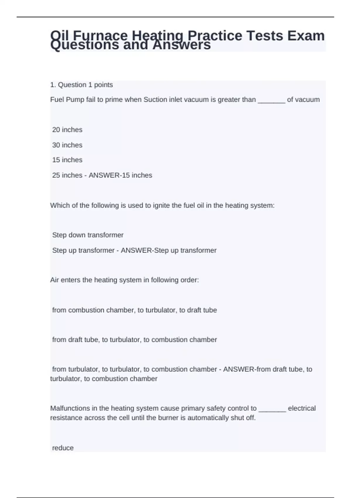 1. Question 1 points Fuel Pump fail to prime when Suction inlet vacuum is greater than _______ of vacuum 20 inches 30 inches 15 inches 25 inches - ANSWER-15 inches Which of the following is used to ignite the fuel oil in the heating system: Step down transformer Step up transformer - ANSWER-Step up transformer Air enters the heating system in following order: from combustion chamber, to turbulator, to draft tube from draft tube, to turbulator, to combustion chamber from turbulator, to turbulator, to combustion chamber - ANSWER-from draft tube, to turbulator, to combustion chamber Malfunctions in the heating system cause primary safety control to _______ electrical resistance across the cell until the burner is automatically shut off.