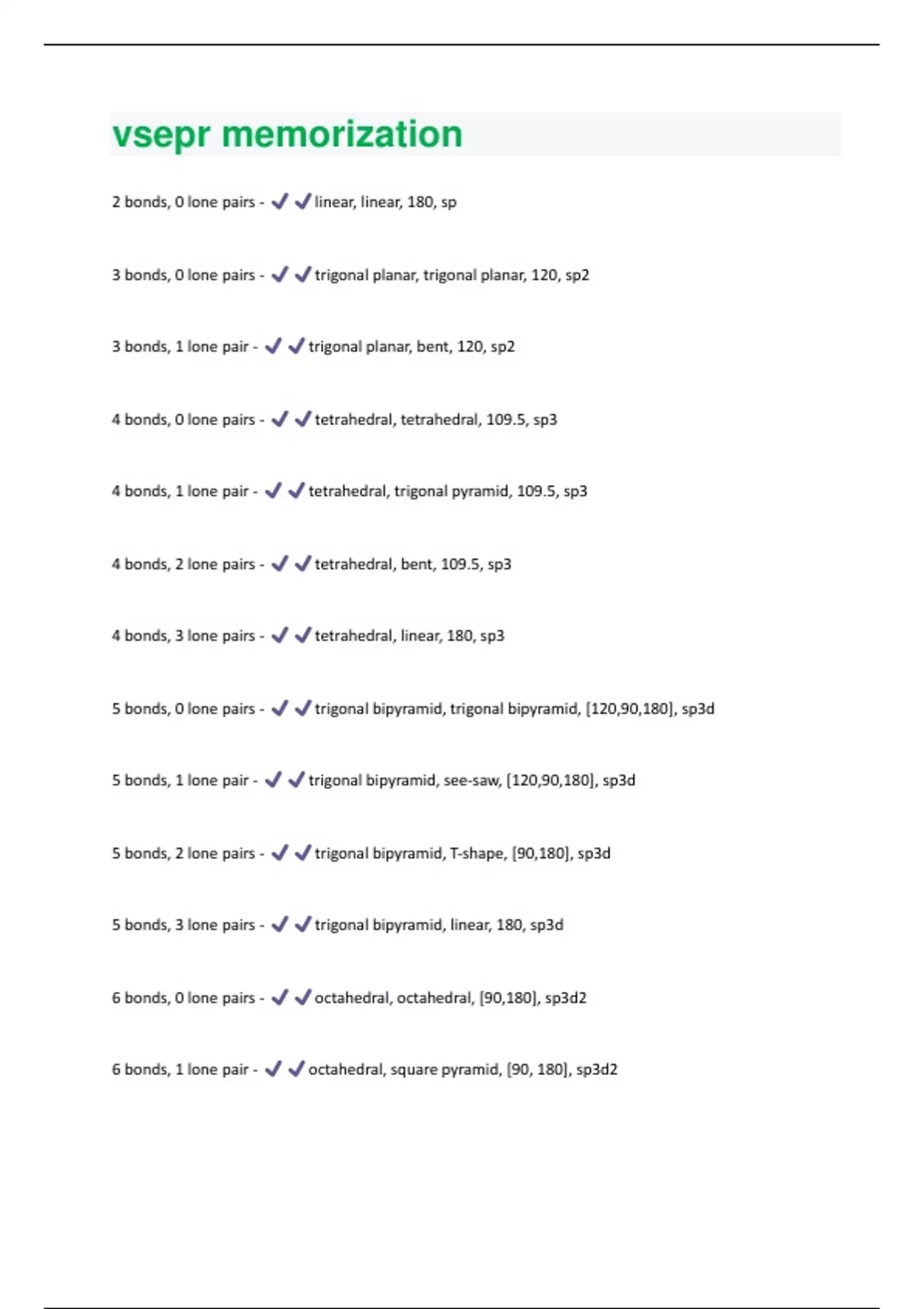 2 bonds, 0 lone pairs - linear, linear, 180, sp 3 bonds, 0 lone pairs - trigonal planar, trigonal planar, 120, sp2 3 bonds, 1 lone pair - trigonal planar, bent, 120, sp2 4 bonds, 0 lone pairs - tetrahedral, tetrahedral, 109.5, sp3 4 bonds, 1 lone pair - tetrahedral, trigonal pyramid, 109.5, sp3 4 bonds, 2 lone pairs - tetrahedral, bent, 109.5, sp3 4 bonds, 3 lone pairs - tetrahedral, linear, 180, sp3 5 bonds, 0 lone pairs - trigonal bipyramid, trigonal bipyramid, [120,90,180], sp3d 5 bonds, 1 lone pair - trigonal bipyramid, see-saw, [120,90,180], sp3d 5 bonds, 2 lone pairs - trigonal bipyramid, T-shape, [90,180], sp3d 5 bonds, 3 lone pairs - trigonal bipyramid, linear, 180, sp3d 6 bonds, 0 lone pairs - octahedral, octahedral, [90,180], sp3d2 6 bonds, 1 lone pair - octahedral, square pyramid, [90, 180], sp3d26 bonds, 2 lone pairs - octahedral, square planar, [90, 180], sp3d2