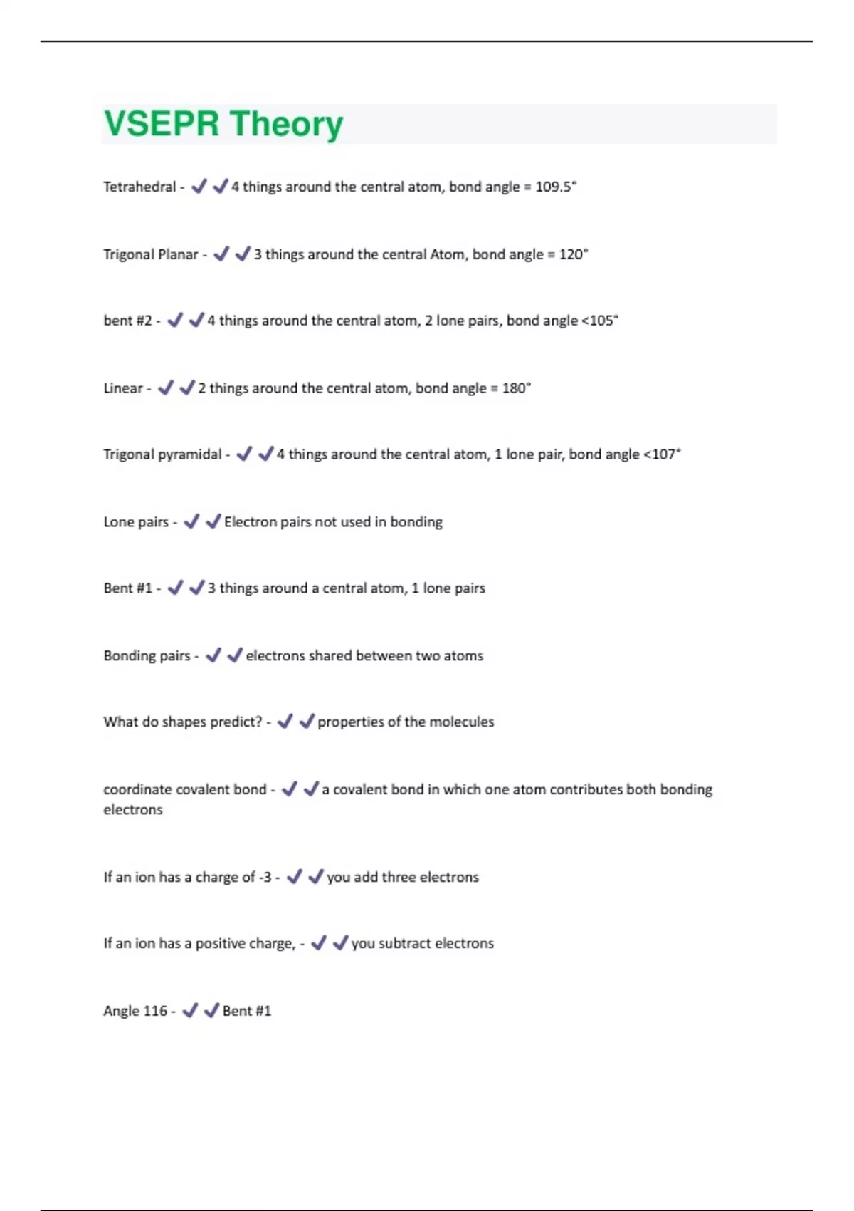 Tetrahedral - 4 things around the central atom, bond angle = 109.5° Trigonal Planar - 3 things around the central Atom, bond angle = 120° bent #2 - 4 things around the central atom, 2 lone pairs, bond angle <105° Linear - 2 things around the central atom, bond angle = 180° Trigonal pyramidal - 4 things around the central atom, 1 lone pair, bond angle <107° Lone pairs - Electron pairs not used in bonding Bent #1 - 3 things around a central atom, 1 lone pairs Bonding pairs - electrons shared between two atoms What do shapes predict? - properties of the molecules coordinate covalent bond - a covalent bond in which one atom contributes both bonding electrons If an ion has a charge of -3 - you add three electrons If an ion has a positive charge, - you subtract electrons Angle 116 - Bent #1Angle 109.5 - tetrahedral Angle 120 - Trigonal Planar Angle 180 - linear Angle 107 - Trigonal pyramidal Angle 105 - Bent #2