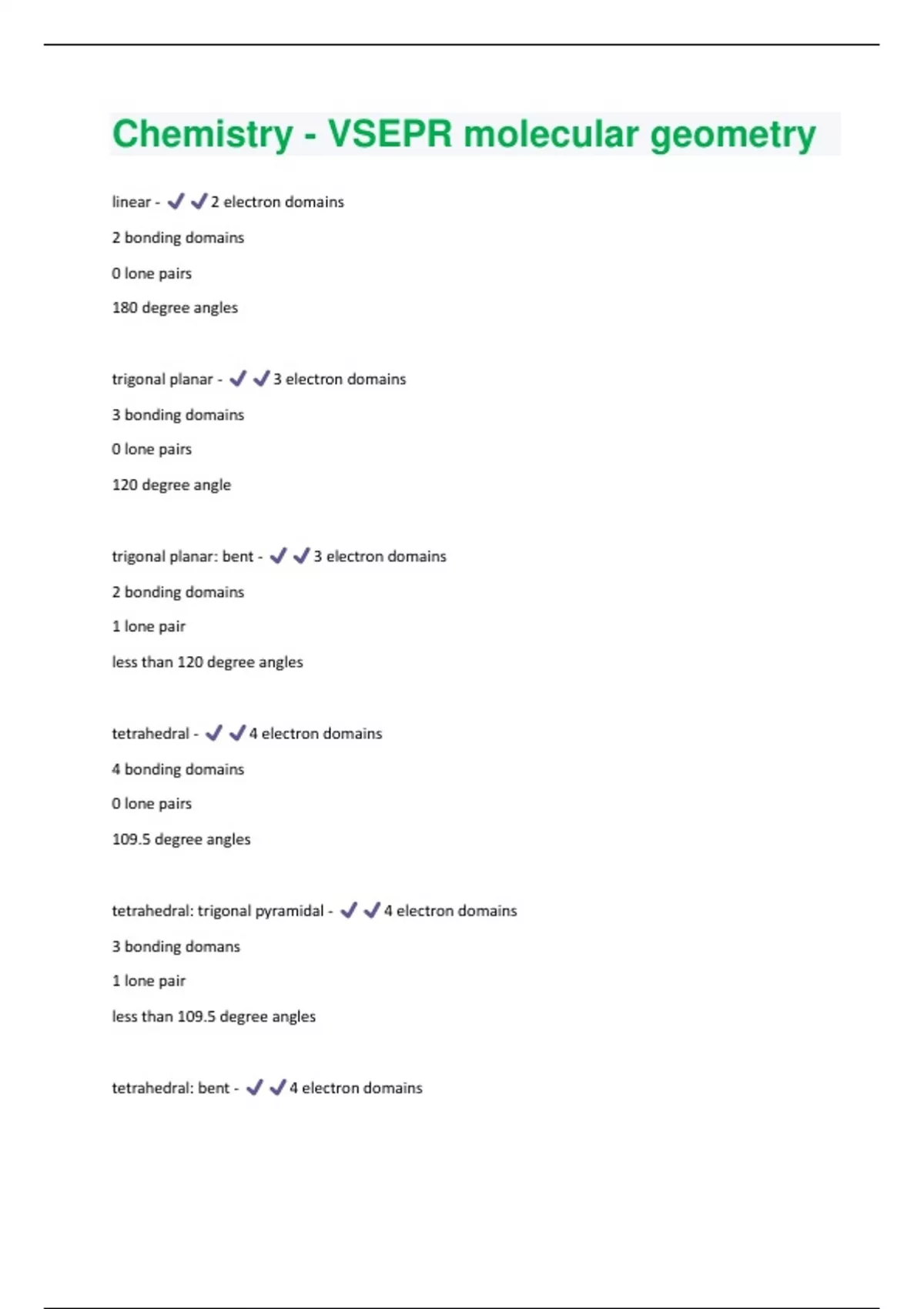 linear - 2 electron domains 2 bonding domains 0 lone pairs 180 degree angles trigonal planar - 3 electron domains 3 bonding domains 0 lone pairs 120 degree angle trigonal planar: bent - 3 electron domains 2 bonding domains 1 lone pair less than 120 degree angles tetrahedral - 4 electron domains 4 bonding domains 0 lone pairs 109.5 degree angles tetrahedral: trigonal pyramidal - 4 electron domains 3 bonding domans 1 lone pair less than 109.5 degree angles tetrahedral: bent - 4 electron domains2 bonding domains 2 lone pairs less than 109.5 degree angles = smaller than trigonal pyramidal trigonal bipyramidal - 5 electron domains 5 bonding domains 0 lone pairs 90 and 120 degree angles