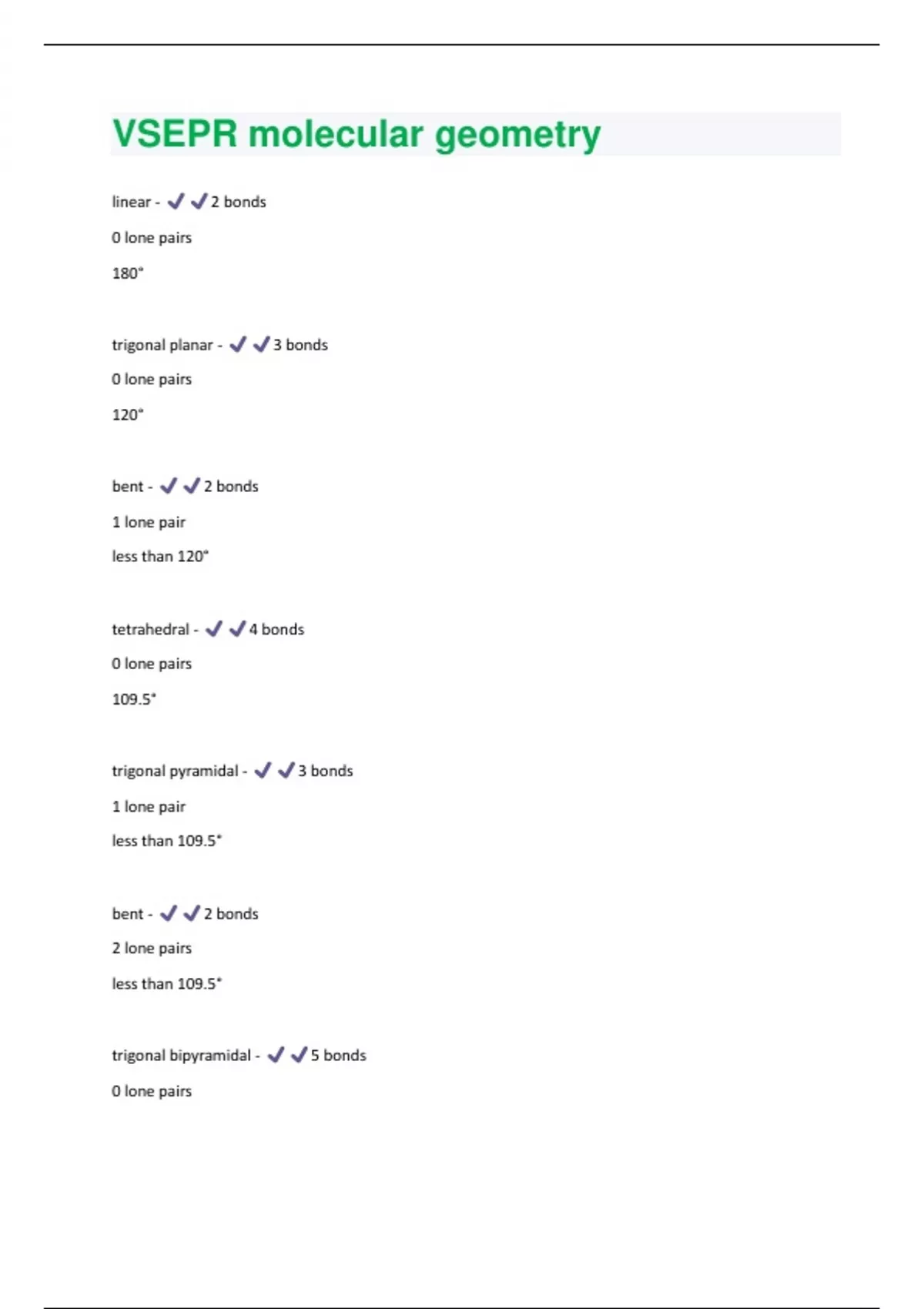 linear - 2 bonds 0 lone pairs 180° trigonal planar - 3 bonds 0 lone pairs 120° bent - 2 bonds 1 lone pair less than 120° tetrahedral - 4 bonds 0 lone pairs 109.5° trigonal pyramidal - 3 bonds 1 lone pair less than 109.5° bent - 2 bonds 2 lone pairs less than 109.5° trigonal bipyramidal - 5 bonds 0 lone pairs90°, 120° seesaw - 4 bonds 1 lone pair less than 90°, less than 120° T-shaped - 3 bonds 2 lone pairs less than 90° linear - 2 bonds 3 lone pairs 180° octahedral - 6 bonds 0 lone pairs 90° square pyramidal - 5 bonds 1 lone pair less than 90° square planar - 4 bonds 2 lone pairs 90° T-shaped - 3 bonds 3 lone pairsless than 90° linear - 2 bonds 4 lone pairs 180°