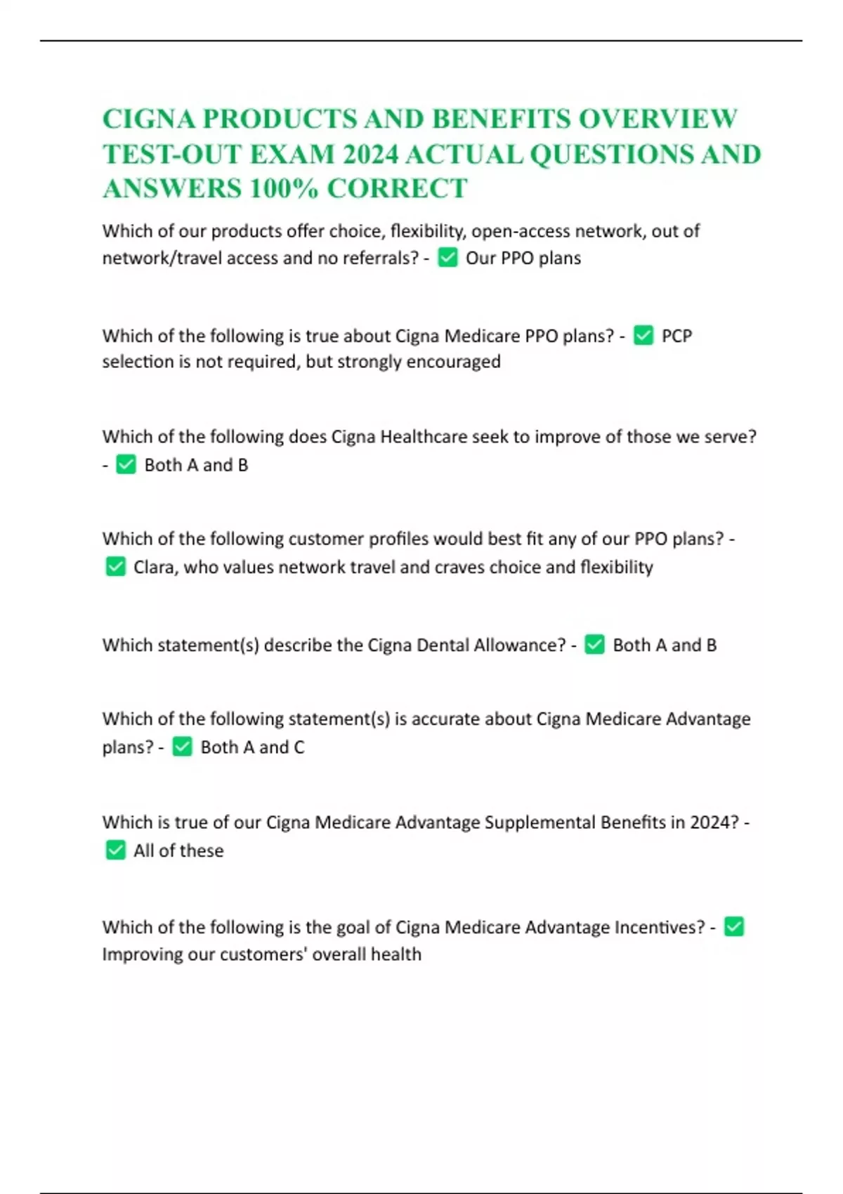 CIGNA PRODUCTS AND BENEFITS OVERVIEW TEST-OUT EXAM 2024 ACTUAL QUESTIONS AND ANSWERS 100% CORRECT