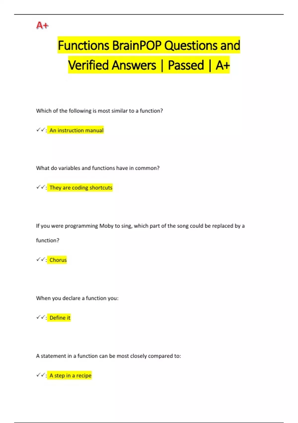 Functions BrainPOP Questions and Verified Answers | Passed | A+