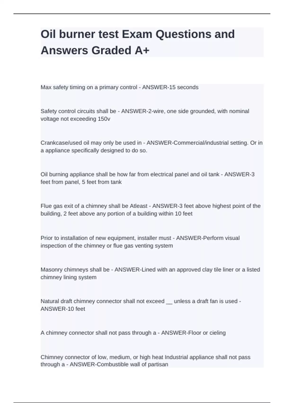 Max safety timing on a primary control - ANSWER-15 seconds Safety control circuits shall be - ANSWER-2-wire, one side grounded, with nominal voltage not exceeding 150v Crankcase/used oil may only be used in - ANSWER-Commercial/industrial setting. Or in a appliance specifically designed to do so. Oil burning appliance shall be how far from electrical panel and oil tank - ANSWER-3 feet from panel, 5 feet from tank Flue gas exit of a chimney shall be Atleast - ANSWER-3 feet above highest point of the building, 2 feet above any portion of a building within 10 feet Prior to installation of new equipment, installer must - ANSWER-Perform visual inspection of the chimney or flue gas venting system Masonry chimneys shall be - ANSWER-Lined with an approved clay tile liner or a listed chimney lining system Natural draft chimney connector shall not exceed __ unless a draft fan is used - ANSWER-10 feet A chimney connector shall not pass through a - ANSWER-Floor or cieling Chimney connector of low, medium, or high heat Industrial appliance shall not pass through a - ANSWER-Combustible wall of partisan