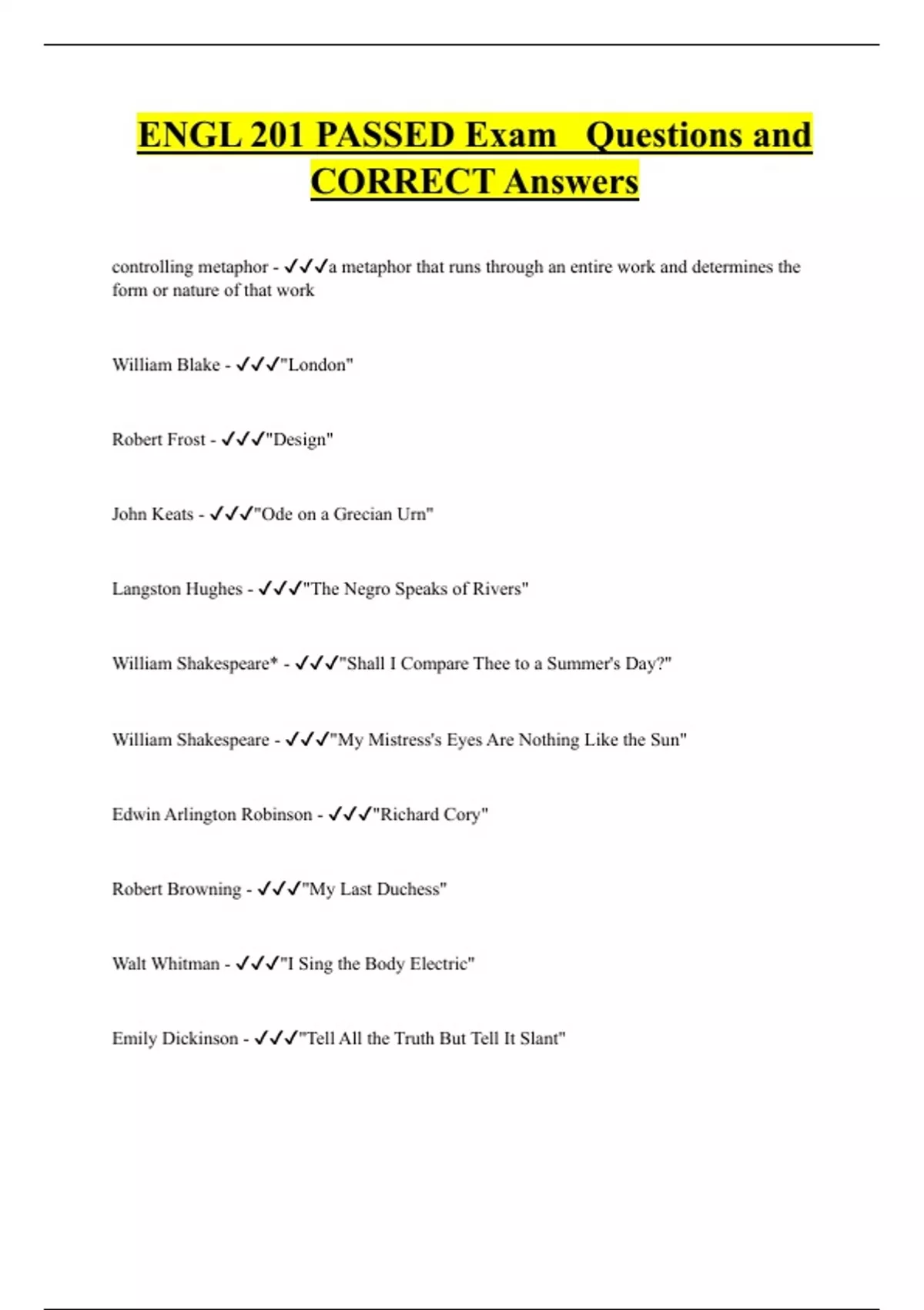 ENGL 201 PASSED Exam Questions and CORRECT Answers
