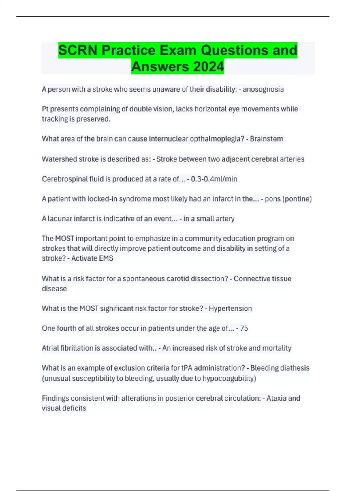 A person with a stroke who seems unaware of their disability: - anosognosia Pt presents complaining of double vision, lacks horizontal eye movements while tracking is preserved. What area of the brain can cause internuclear opthalmoplegia? - Brainstem Watershed stroke is described as: - Stroke between two adjacent cerebral arteries Cerebrospinal fluid is produced at a rate of... - 0.3-0.4ml/min A patient with locked-in syndrome most likely had an infarct in the... - pons (pontine) A lacunar infarct is indicative of an event... - in a small artery The MOST important point to emphasize in a community education program on strokes that will directly improve patient outcome and disability in setting of a stroke? - Activate EMS What is a risk factor for a spontaneous carotid dissection? - Connective tissue disease What is the MOST significant risk factor for stroke? - Hypertension One fourth of all strokes occur in patients under the age of... - 75 Atrial fibrillation is associated with.. - An increased risk of stroke and mortality What is an example of exclusion criteria for tPA administration? - Bleeding diathesis (unusual susceptibility to bleeding, usually due to hypocoagubility) Findings consistent with alterations in posterior cerebral circulation: - Ataxia and visual deficits Predictor of a two-day risk for stroke following a TIA: - ABCD2 What sign elicited during a physical examination would be indicative of meningeal irritation? - Kernig's Sign The most sensitive and specific imaging technique for demonstrating acute infarction is... - MR diffusion-weighted imaging A patient with SAH is ordered a cerebral angiogram. This test should... - identify the etiology of the bleed What diagnosis in a patient is a contraindication in performing a lumbar puncture? - SAH A neurologist has ordered a TTE. This test is best at identifying... - ventricular thrombus A woman with sickle cell disease is being seen for preventative stroke diagnostic testing. What procedure would you expect to be performed? - Transcranial doppler A patient is scheduled for embolization of L AVM. The goal of the treatment is... - Occlusion of the deep arterial feeding vessels Pt with recent head trauma presents with pulstile tinnitus, headache, and visual disturbances. These symptoms may indicate... - dural arteriovenous fistula MRI report describes a low flow, low pressure vascular lesion in the left temporal lobe. The RN identifies that this is most likely... - Cavernous angioma Pt has slow speech with inappropriate silences and audible inspirations. The RN identifies this as... - Dysarthia When administering mannitol IV every 3 hours, the primary nursing considerations include... - Serum osmolality, CPP goals, and fluid balance Primary laboratory testing/monitoring for heparin infusion: - APTT