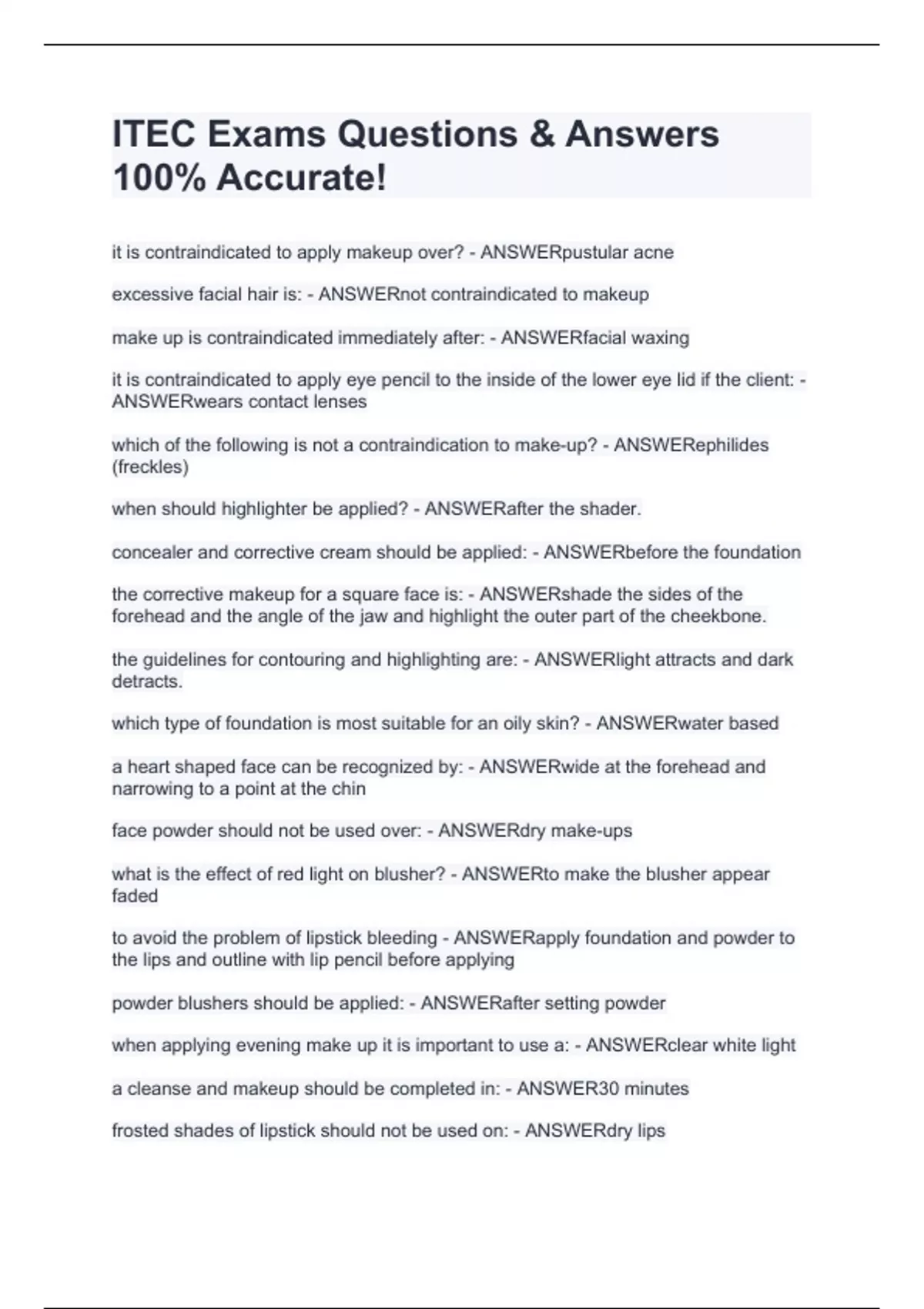 it is contraindicated to apply makeup over? - ANSWERpustular acne excessive facial hair is: - ANSWERnot contraindicated to makeup make up is contraindicated immediately after: - ANSWERfacial waxing it is contraindicated to apply eye pencil to the inside of the lower eye lid if the client: - ANSWERwears contact lenses which of the following is not a contraindication to make-up? - ANSWERephilides (freckles) when should highlighter be applied? - ANSWERafter the shader. concealer and corrective cream should be applied: - ANSWERbefore the foundation the corrective makeup for a square face is: - ANSWERshade the sides of the forehead and the angle of the jaw and highlight the outer part of the cheekbone. the guidelines for contouring and highlighting are: - ANSWERlight attracts and dark detracts. which type of foundation is most suitable for an oily skin? - ANSWERwater based a heart shaped face can be recognized by: - ANSWERwide at the forehead and narrowing to a point at the chin face powder should not be used over: - ANSWERdry make-ups