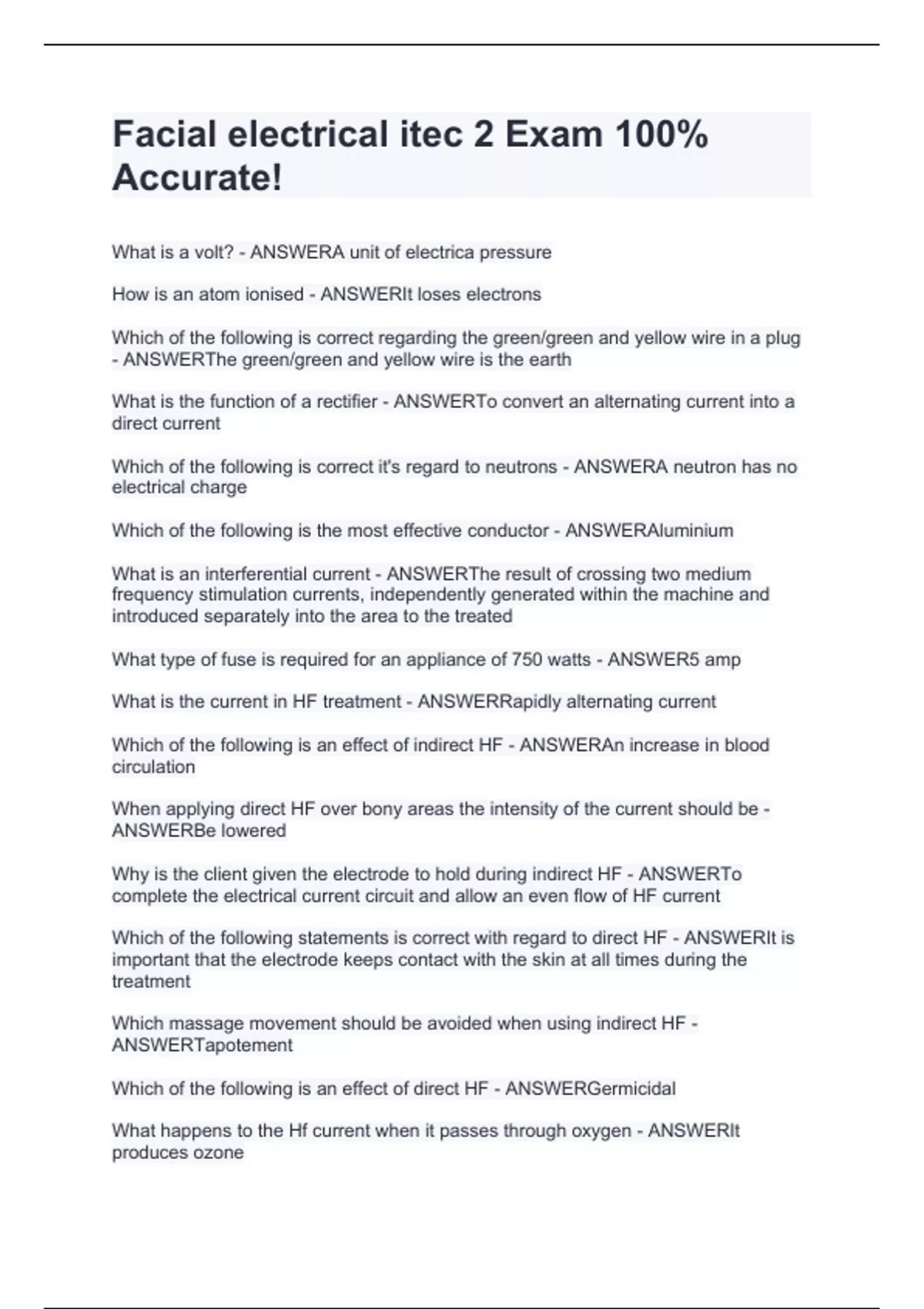 What is a volt? - ANSWERA unit of electrica pressure How is an atom ionised - ANSWERIt loses electrons Which of the following is correct regarding the green/green and yellow wire in a plug - ANSWERThe green/green and yellow wire is the earth What is the function of a rectifier - ANSWERTo convert an alternating current into a direct current Which of the following is correct it's regard to neutrons - ANSWERA neutron has no electrical charge Which of the following is the most effective conductor - ANSWERAluminium What is an interferential current - ANSWERThe result of crossing two medium frequency stimulation currents, independently generated within the machine and introduced separately into the area to the treated What type of fuse is required for an appliance of 750 watts - ANSWER5 amp What is the current in HF treatment - ANSWERRapidly alternating current Which of the following is an effect of indirect HF - ANSWERAn increase in blood ci