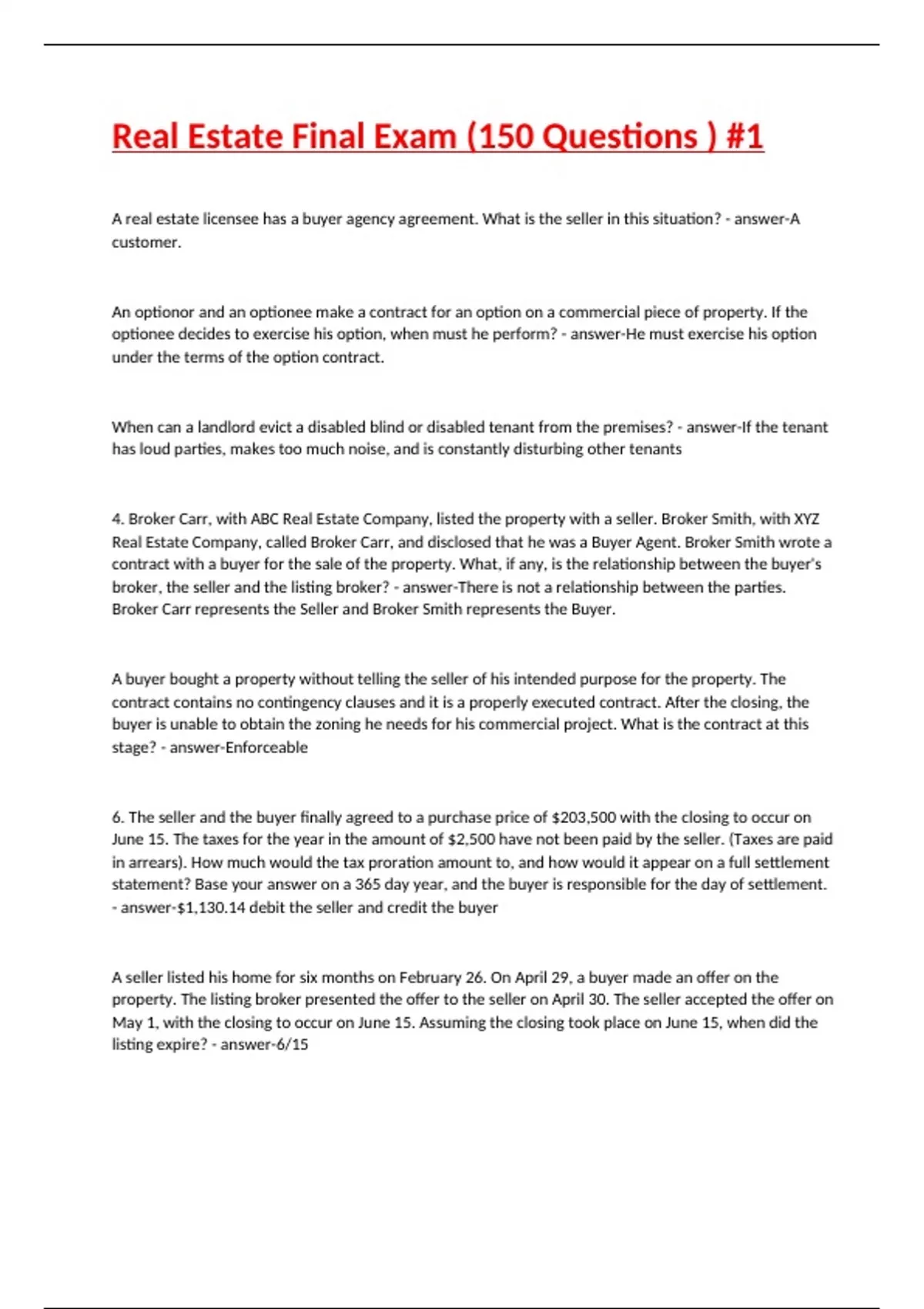 A real estate licensee has a buyer agency agreement. What is the seller in this situation? - answer-A customer. An optionor and an optionee make a contract for an option on a commercial piece of property. If the optionee decides to exercise his option, when must he perform? - answer-He must exercise his option under the terms of the option contract. When can a landlord evict a disabled blind or disabled tenant from the premises? - answer-If the tenant has loud parties, makes too much noise, and is constantly disturbing other tenants 4. Broker Carr, with ABC Real Estate Company, listed the property with a seller. Broker Smith, with XYZ Real Estate Company, called Broker Carr, and disclosed that he was a Buyer Agent. Broker Smith wrote a contract with a buyer for the sale of the property. What, if any, is the relationship between the buyer's broker, the seller and the listing broker? - answer-There is not a relationship between the parties. Broker Carr represents the Seller and Broker Smith represents the Buyer. A buyer bought a property without telling the seller of his intended purpose for the property. The contract contains no contingency clauses and it is a properly executed contract. After the closing, the buyer is unable to obtain the zoning he needs for his commercial project. What is the contract at this stage? - answer-Enforceable 6. The seller and the buyer finally agreed to a purchase price of $203,500 with the closing to occur on June 15. The taxes for the year in the amount of $2,500 have not been paid by the seller. (Taxes are paid in arrears). How much would the tax proration amount to, and how would it appear on a full settlement statement? Base your answer on a 365 day year, and the buyer is responsible for the day of settlement. - answer-$1,130.14 debit the seller and credit the buyer A seller listed his home for six months on February 26. On April 29, a buyer made an offer on the property. The listing broker presented the offer to the seller on April 30. The seller accepted the offer on May 1, with the closing to occur on June 15. Assuming the closing took place on June 15, when did the listing expire? - answer-6/15 The sellers listed their property for six months on February 26 for $522,500. They agreed to pay the listing broker a 7% commission at closing on the agreed upon sale price. A buyer made an offer on the property on March 29 for $510,000. The seller countered the offer on April 1 at $517,500, and the buyer accepted the counter offer with the closing to occur on June 15. How much commission did the seller owe the listing broker, and how would it appear on the settlement statement? - answer-$36,225. Debit the seller. The seller and the buyer agreed to a purchase price of $270,000 with the closing to occur on June 15. The seller's loan balance after the June 1 payment was $170,000. with an interest rate of 6%.The monthly payment was $1,800 principal and interest. What was the loan balance the day of closing, and how much interest did the seller owe the bank? - answer-Loan balance $170,000; interest due $425