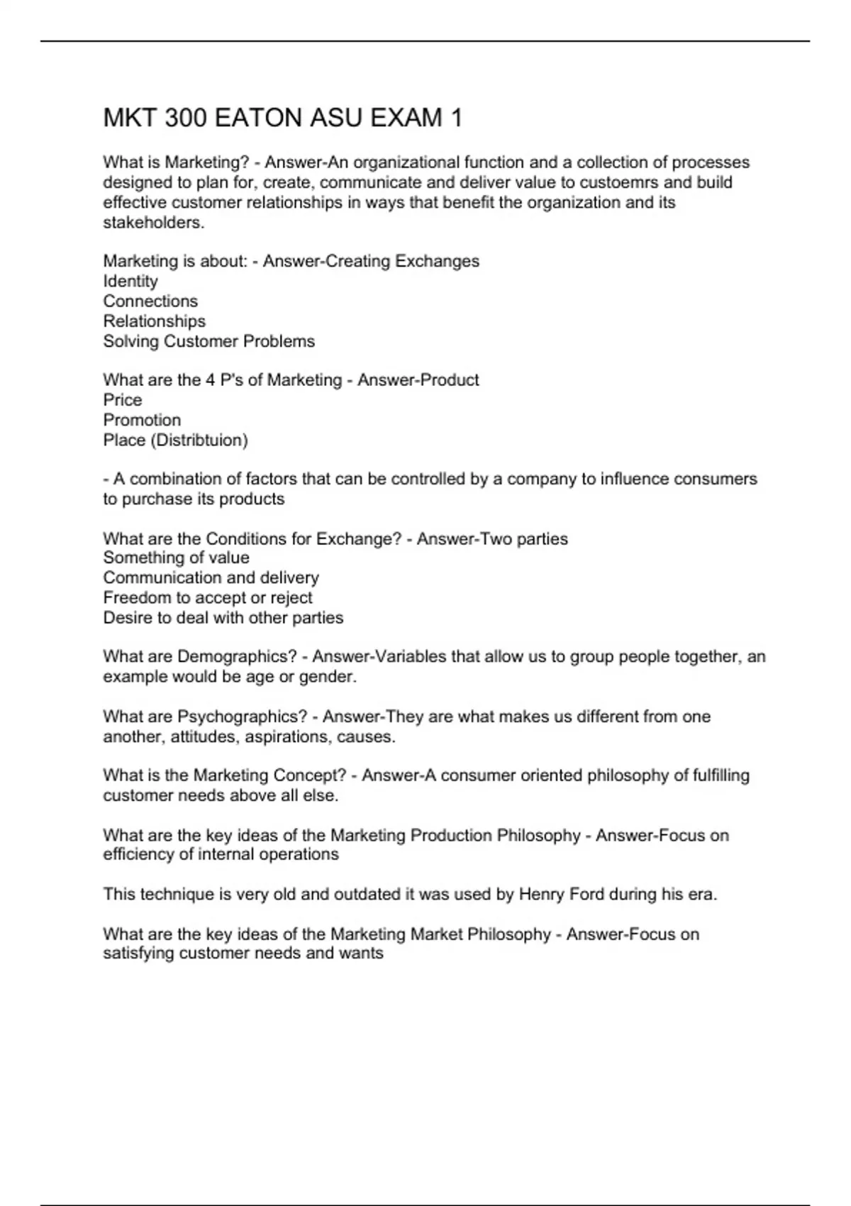 What is Marketing? - Answer-An organizational function and a collection of processes designed to plan for, create, communicate and deliver value to custoemrs and build effective customer relationships in ways that benefit the organization and its stakeholders. Marketing is about: - Answer-Creating Exchanges Identity Connections Relationships Solving Customer Problems What are the 4 P's of Marketing - Answer-Product Price Promotion Place (Distribtuion) - A combination of factors that can be controlled by a company to influence consumers to purchase its products What are the Conditions for Exchange? - Answer-Two parties Something of value Communication and delivery Freedom to accept or reject Desire to deal with other parties What are Demographics? - Answer-Variables that allow us to group people together, an example would be age or gender. What are Psychographics? - Answer-They are what makes us different from one another, attitudes, aspirations, causes. What is the Marketing Concept? - Answer-A consumer oriented philosophy of fulfilling customer needs above all else. What are the key ideas of the Marketing Production Philosophy - Answer-Focus on efficiency of internal operations This technique is very old and outdated it was used by Henry Ford during his era. What are the key ideas of the Marketing Market Philosophy - Answer-Focus on satisfying customer needs and wants