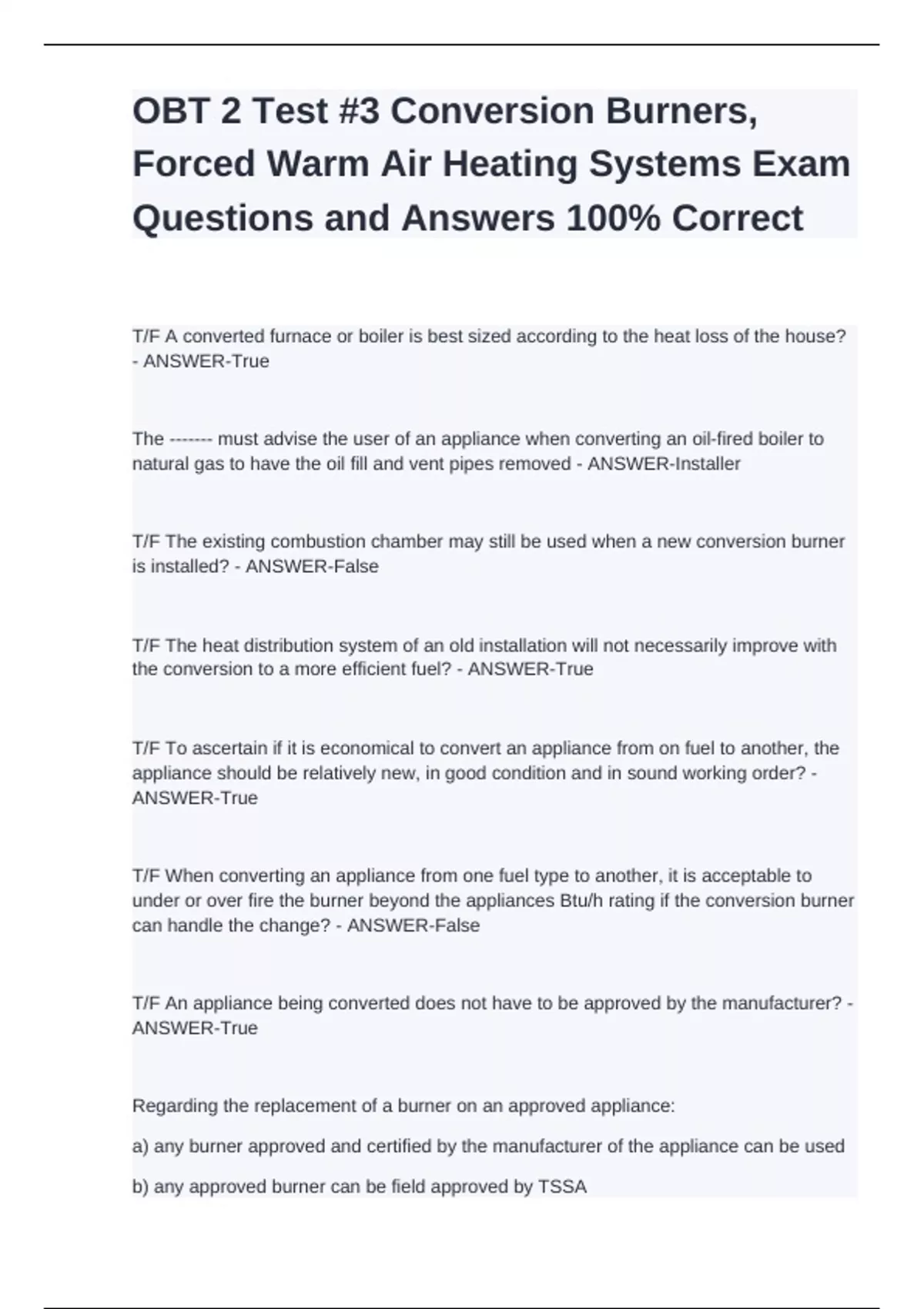 OBT 2 Test #3 Conversion Burners, Forced Warm Air Heating Systems Exam Questions and Answers 100% Correct