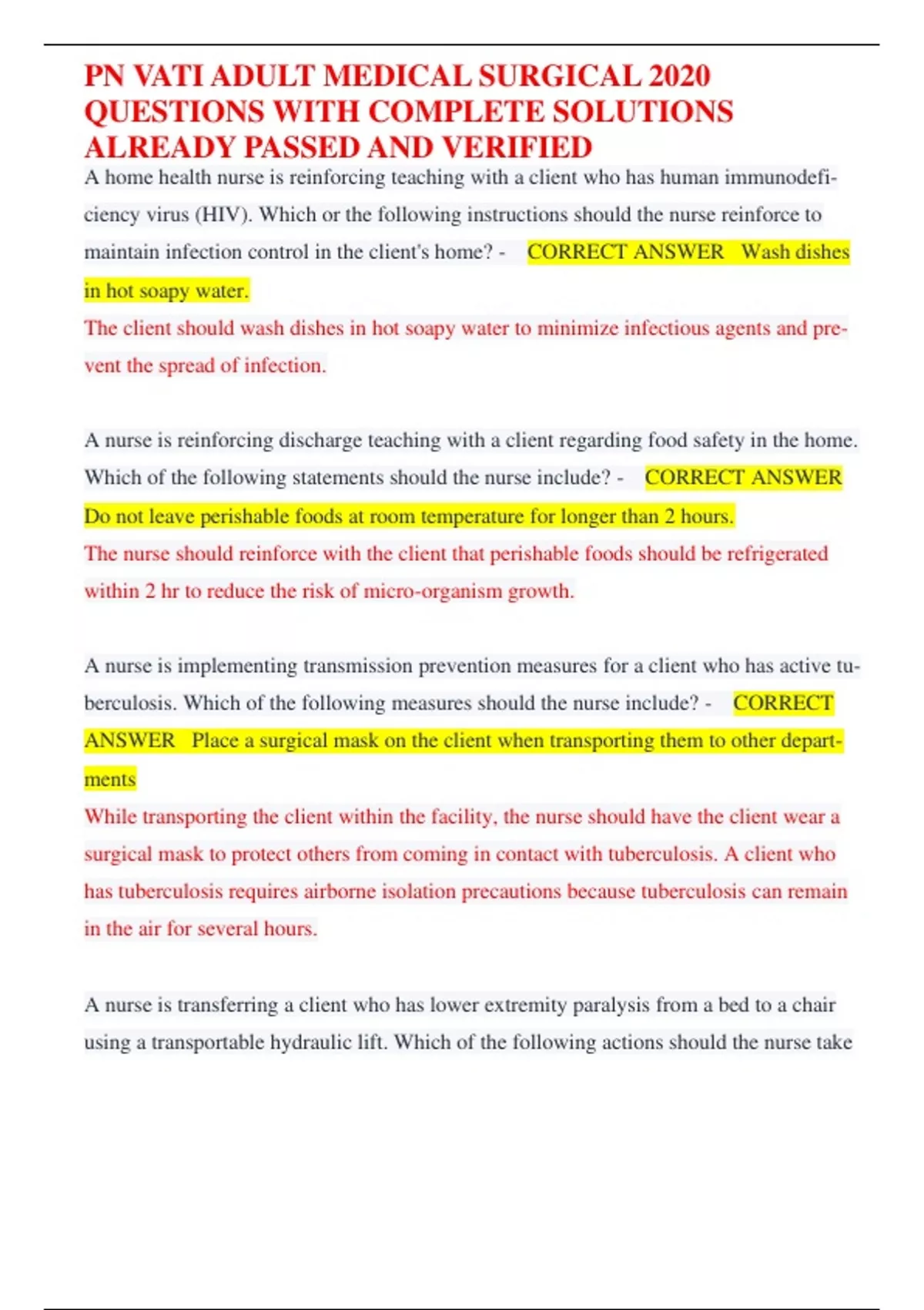 PN VATI ADULT MEDICAL SURGICAL 2020 QUESTIONS WITH COMPLETE SOLUTIONS A home health nurse is reinforcing teaching with a client who has human immunodeficiency virus (HIV). Which or the following instructions should the nurse reinforce to maintain infection control in the client's home? - CORRECT ANSWER Wash dishes in hot soapy water. The client should wash dishes in hot soapy water to minimize infectious agents and prevent the spread of infection. A nurse is reinforcing discharge teaching with a client regarding food safety in the home. Which of the following statements should the nurse include? - CORRECT ANSWER Do not leave perishable foods at room temperature for longer than 2 hours. The nurse should reinforce with the client that perishable foods should be refrigerated within 2 hr to reduce the risk of micro-organism growth. A nurse is implementing transmission prevention measures for a client who has active tuberculosis. Which of the following measures should the nurse include? - CORRECT