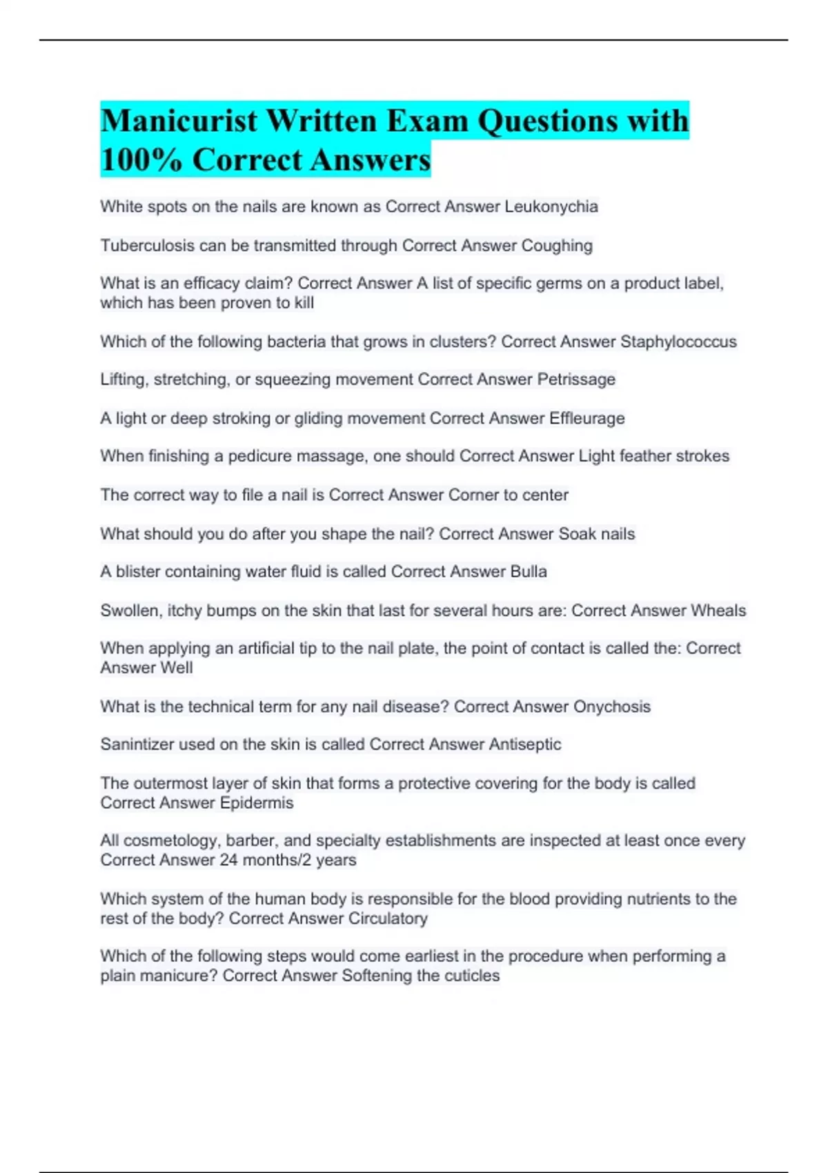 Manicurist Written Exam Questions with 100% Correct Answers