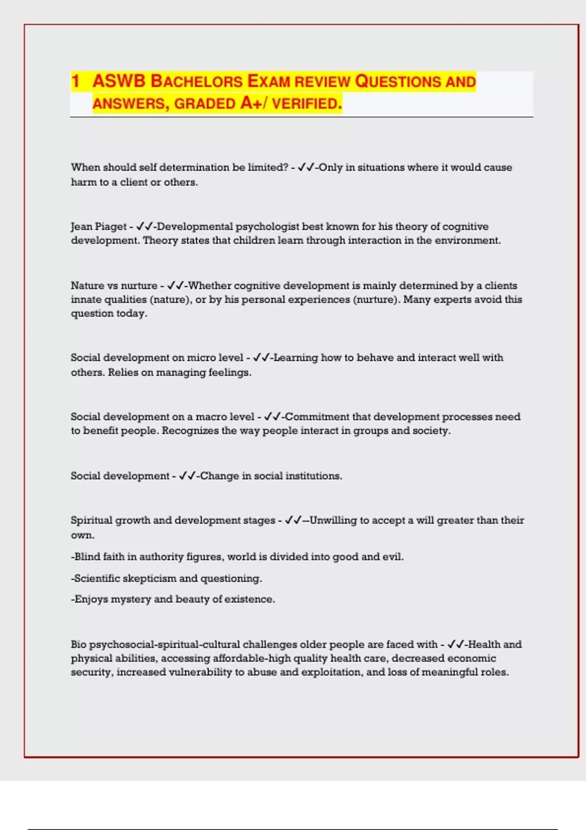 ASWB BACHELORS EXAM REVIEW QUESTIONS AND ANSWERS, GRADED A+/ VERIFIED. When should self determination be limited? - -Only in situations where it would cause harm to a client or others. Jean Piaget - -Developmental psychologist best known for his theory of cognitive development. Theory states that children learn through interaction in the environment. Nature vs nurture - -Whether cognitive development is mainly determined by a clients innate qualities (nature), or by his personal experiences (nurture). Many experts avoid this question today. Social development on micro level - -Learning how to behave and interact well with others. Relies on managing feelings. Social development on a macro level - -Commitment that development processes need to benefit people. Recognizes the way people interact in groups and society. Social development - -Change in social institutions. Spiritual growth and development stages - --Unwilling to accept a will greater than their own. -Blind faith in authority figures, world is divided into good and evil. -Scientific skepticism and questioning. -Enjoys mystery and beauty of existence. Bio psychosocial-spiritual-cultural challenges older people are faced with - -Health and physical abilities, accessing affordable-high quality health care, decreased economic security, increased vulnerability to abuse and exploitation, and loss of meaningful roles. Health care issues with adults 80+ - -Communication: Encourage to express feelings, stay positive Health: monitor closely, promote self care, ensure nutrition, stress, and activity levels Safety:ensure safe living Development - -Product of the elaborate interplay of biological, psychological, spiritual, and social influences John Bowlby - -Originated Attachment Theory. Attachment: defined by Bowlby - -A lasting psychological connectedness that can be understood within an evolutionary context in which a caregiver provides safety and security to a child. Child is pre-programmed to create attachments. Monotropy - -One primary attachment figure. Acts as a secure base for exploring the world. Learned behavior attachment - -Child will form an attachment to whoever feeds it. Child finds comfort in food, through classical conditioning, f