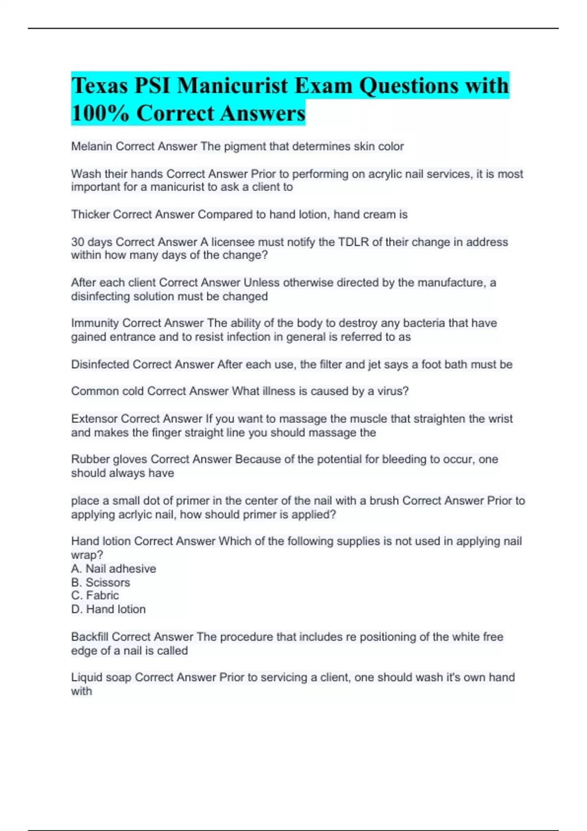 Texas PSI Manicurist Exam Questions with 100% Correct Answers
