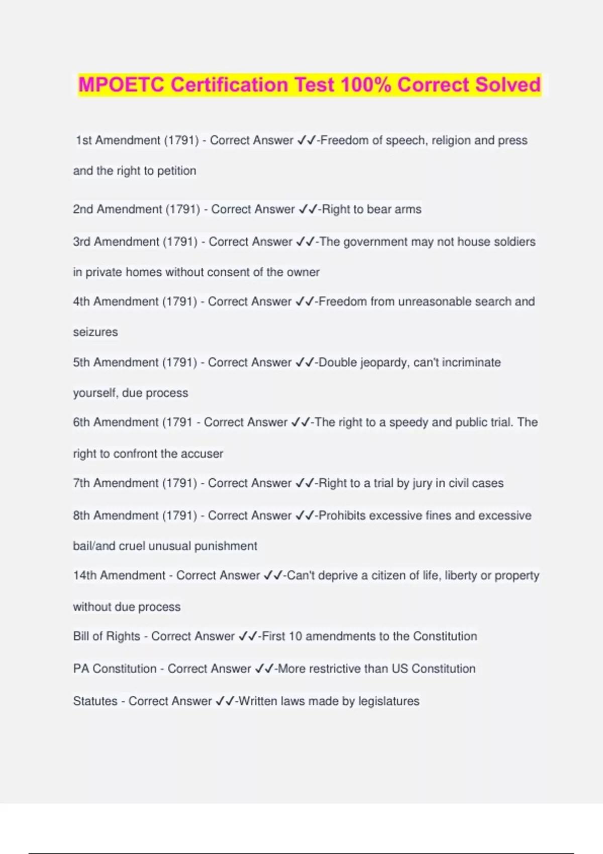 MPOETC Certification Test 100% Correct Solved 1st Amendment (1791) - Correct Answer ️️ -Freedom of speech, religion and press and the right to petition 2nd Amendment (1791) - Correct Answer ️️ -Right to bear arms 3rd Amendment (1791) - Correct Answer ️️ -The government may not house soldiers in private homes without consent of the owner 4th Amendment (1791) - Correct Answer ️️ -Freedom from unreasonable search and seizures 5th Amendment (1791) - Correct Answer ️️ -Double jeopardy, can't incriminate yourself, due process 6th Amendment (1791 - Correct Answer ️️ -The right to a speedy and public trial. The right to confront the accuser 7th Amendment (1791) - Correct Answer ️️ -Right to a trial by jury in civil cases 8th Amendment (1791) - Correct Answer ️️ -Prohibits excessive fines and excessive bail/and cruel unusual punishment 14th Amendment - Correct Answer ️️ -Can't deprive a citizen of life, liberty or property without due process Bill of Rights - Correct Answer ️️ -First 10 amendments to the Constitution PA Constitution - Correct Answer ️️ -More restrictive than US Constitution Statutes - Correct Answer ️️ -Written laws made by legislatures civil rights violation - Correct Answer ️️ -Unlawful arrest, search and seizure without probable cause. Holding a prisoner beyond limitations When can officers enter another jurisdiction - Correct Answer ️️ -Hot pursuit, asked, mutual aid, official business and felony crimes case laws - Correct Answer ️️ -Written decision of appellate courts deciding actual cases Tort - Correct Answer ️️ -A violation of the civil law Probable cause - Correct Answer ️️ -Facts and circumstances that lead a reasonable person to believe a crime had been committed and the suspect committed the crime Three branches of government - Correct Answer ️️ -Legislative, Executive, Judicial What branch of government do police fall under? - Correct Answer ️️ -Executive PA Court System - Correct Answer ️️ -Common Pleas, Circuit, Supreme US Court System - Correct Answer ️️ -District, circuit, supreme Grading of crimes - Correct Answer ️️ -Felony, misdemeanor, summary State of mind (Mens Rea) 4 - Correct Answer ️️ -Mental intent to commit crime - Recklessly - Intentionally - Negligently - Knowingly Where are statutes of limitations found? - Correct Answer ️️ -Title 42, section 5552 judiciary code Codification - Correct Answer ️️ -The act or process of rendering laws in written form 2 elements of a crime - Correct Answer ️️ -Physical act of crime (Actus Reus), Mental intend to do so (Mens Rea) Instrument of a crime - Correct Answer ️️ -Any instrument that is intended to be used to commit a crime 1st degree murder - Correct Answer ️️ -2502 - killing that is premeditated, deliberate and done with malice Felony Crimes - Correct Answer ️️ -Murder, rape, kidnapping, arson, robbery, burglary, embezzlement, forgery, theft, and perjury Voluntary Manslaughter - Correct Answer ️️ -2503 - unlawful killing of a human being in sudden heat of passion upon sufficient legal provocation. Felony 2 Stalking - Correct Answer ️️ -2709 - Repeatedly following, ha