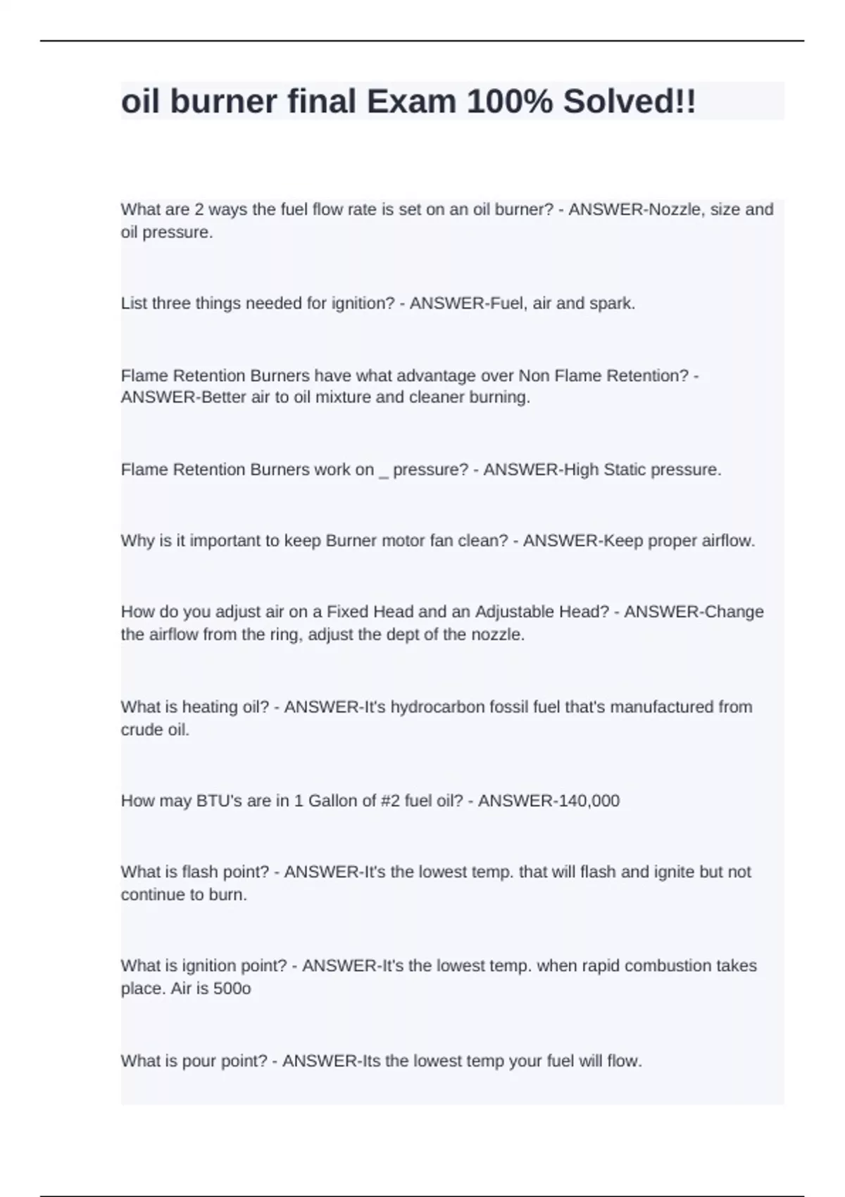 List three things needed for ignition? - ANSWER-Fuel, air and spark. Flame Retention Burners have what advantage over Non Flame Retention? - ANSWER-Better air to oil mixture and cleaner burning. Flame Retention Burners work on _ pressure? - ANSWER-High Static pressure. Why is it important to keep Burner motor fan clean? - ANSWER-Keep proper airflow. How do you adjust air on a Fixed Head and an Adjustable Head? - ANSWER-Change the airflow from the ring, adjust the dept of the nozzle. What is heating oil? - ANSWER-It's hydrocarbon fossil fuel that's manufactured from crude oil. How may BTU's are in 1 Gallon of #2 fuel oil? - ANSWER-140,000 What is flash point? - ANSWER-It's the lowest temp. that will flash and ignite but not continue to burn. What is ignition point? - ANSWER-It's the lowest temp. when rapid combustion takes place. Air is 500o What is pour point? - ANSWER-Its the lowest temp your fuel will flow. On an outside oil tank, what happens to the viscosity of fuel oil? - ANSWER-Viscosity will increase and slows down. What causes Sulfuric Acid in a heating system? - ANSWER-When sulfur in the oil burns and mixes with moisture. What is in the sluge at the bottom of the oil tank? - ANSWER-Bacteria, rust or mold. List a few reasons of how water would get into an oil tank? - ANSWER-Condensation, vent caps and loose or missing joints. What are a few good practices of oil tank installs? - ANSWER-Still pipe, mealable joints, alarm vents 5ft from oil burner and inspect tank and keep elevated. What is the function of a fuel pump on an oil function? - ANSWER-Lift the oil from the tank and deliver it at a constant and regulated pressure to the nozzle. Is a 2 pipe oil pump is a self bleeding pump? - ANSWER-True Will an oil leak on the return oil line affect the performance of oil burner? - ANSWER-No. What is the factory set point on an oil pump and minimum operating pressure? - ANSWER-100 psi for both.