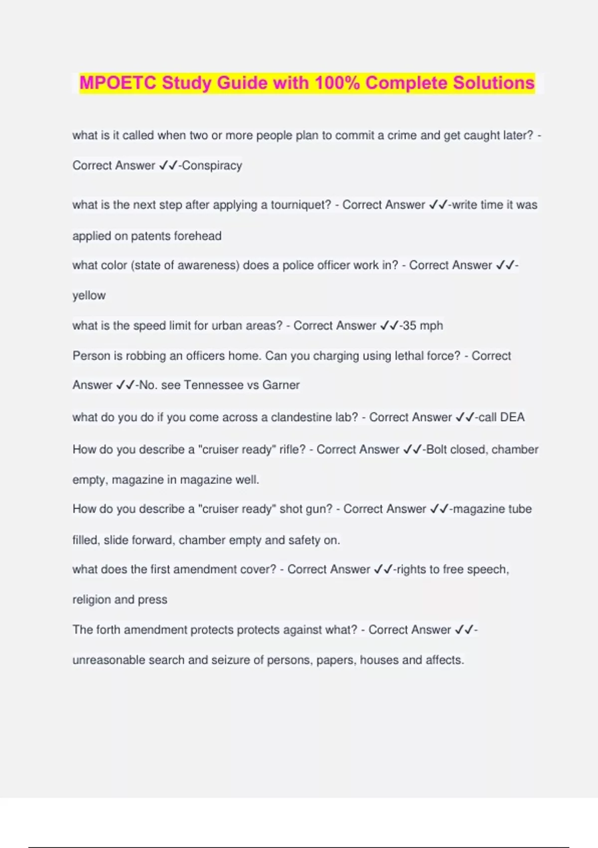 MPOETC Study Guide with 100% Complete Solutions what is it called when two or more people plan to commit a crime and get caught later? - Correct Answer ️️ -Conspiracy what is the next step after applying a tourniquet? - Correct Answer ️️ -write time it was applied on patents forehead what color (state of awareness) does a police officer work in? - Correct Answer ️️ - yellow what is the speed limit for urban areas? - Correct Answer ️️ -35 mph Person is robbing an officers home. Can you charging using lethal force? - Correct Answer ️️ -No. see Tennessee vs Garner what do you do if you come across a clandestine lab? - Correct Answer ️️ -call DEA How do you describe a "cruiser ready" rifle? - Correct Answer ️️ -Bolt closed, chamber empty, magazine in magazine well. How do you describe a "cruiser ready" shot gun? - Correct Answer ️️ -magazine tube filled, slide forward, chamber empty and safety on. what does the first amendment cover? - Correct Answer ️️ -rights to free speech, religion and press The forth amendment protects protects against what? - Correct Answer ️️ - unreasonable search and seizure of persons, papers, houses and affects. what right does the 5th amendment cover? - Correct Answer ️️ -the right to due process, no double Jeopardy, right against self-incrimination and compensation for public taking a property. see Miranda vs Arizona. what are the 6th amendment rights? - Correct Answer ️️ -covers the right to a speedy trial, rights to counsel, and a person's rights to be confronted by witnesses against him. what are the eighth amendment rights? - Correct Answer ️️ -right to no excessive bail or fines imposed and protects against cruel and unusual punishment what are the rights protected by the fourteenth amendment? - Correct Answer ️️ -the right to life liberty and the pursuit of happiness and equal rights to all. which case law covers the exclusionary rule which includes violations of the Fourth amendment? - Correct Answer ️️ -mapp vs Ohio which amendment provides guidelines for use of force? - Correct Answer ️️ -the Fourth amendment Commonwealth vs Magliocco - Correct Answer ️️ -a person cannot be convicted of ethnic intimidation without being found guilty of a predicte crime. what is the charge if someone punches a cop? - Correct Answer ️️ -aggravated assault. this is a felony and is an attempt to cause serious bodily injury, recklessly and knowingly what is the charge of the fight between a guy and a girl? - Correct Answer ️️ -simple assault this is a misdemeanor a woman tries to stab a guy but misses. what is the charge? - Correct Answer ️️ - aggravated assault with criminal intent what step needs to be taken when a juvenile hits a teacher? - Correct Answer ️️ - violent juvenile petition motorcycle is not correct... - Correct Answer ️️ -pull up to white line, wait 30 seconds and look both ways. what does the hazard symbol of the diamond stand for? - Correct Answer ️️ - flammable what is the procedure for interviewing a child witness in a domestic to parents? - Correct Answer ️️ -do not interview the child with the parents officer shot in the leg by an active shooter. what do you do? - Correct
