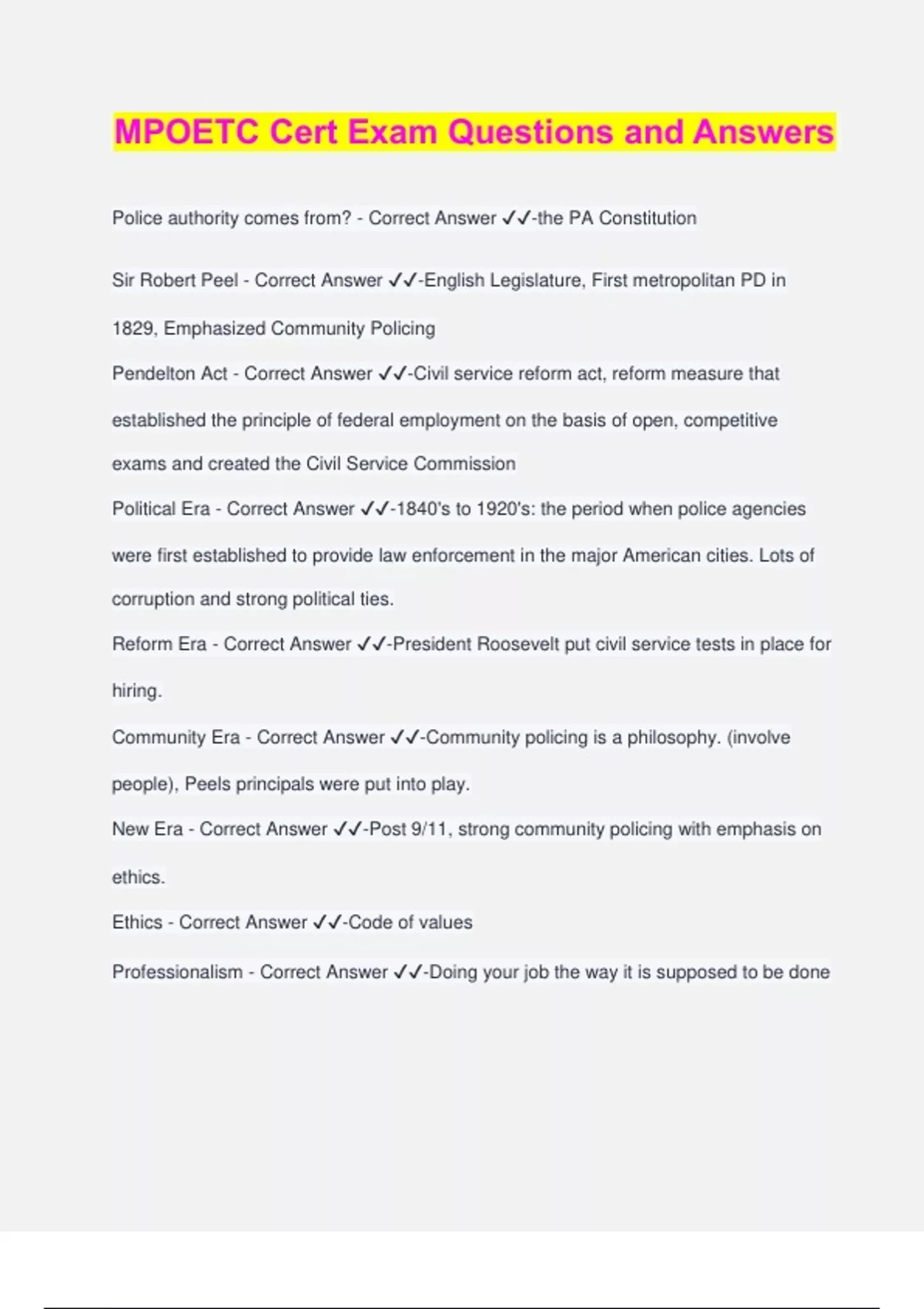MPOETC Cert Exam Questions and Answers Police authority comes from? - Correct Answer ️️ -the PA Constitution Sir Robert Peel - Correct Answer ️️ -English Legislature, First metropolitan PD in 1829, Emphasized Community Policing Pendelton Act - Correct Answer ️️ -Civil service reform act, reform measure that established the principle of federal employment on the basis of open, competitive exams and created the Civil Service Commission Political Era - Correct Answer ️️ -1840's to 1920's: the period when police agencies were first established to provide law enforcement in the major American cities. Lots of corruption and strong political ties. Reform Era - Correct Answer ️️ -President Roosevelt put civil service tests in place for hiring. Community Era - Correct Answer ️️ -Community policing is a philosophy. (involve people), Peels principals were put into play. New Era - Correct Answer ️️ -Post 9/11, strong community policing with emphasis on ethics. Ethics - Correct Answer ️️ -Code of values Professionalism - Correct Answer ️️ -Doing your job the way it is supposed to be done Public trust - Correct Answer ️️ -The granting of public authority to a government representative with the explicit requirement that authority be exercised on behalf of the public Community oriented philosophy - Correct Answer ️️ -Policing based on the concept that that police officers and citizens must work together to help solve community problems related to crime, fear of crime and neighborhood disorder. Goals of the criminal justice system - Correct Answer ️️ -due process - protect people Crime prevention - deterrence - incapacitation - rehabilitation Levels of courts - Correct Answer ️️ -- Magisterial District Court - Common Pleas Court - Superior Court - State Supreme Court - US Supreme Court Branches of Criminal Justice Ststem - Correct Answer ️️ -- Police - Courts - Corrections 1st Amendment - Correct Answer ️️ -Freedom of Religion, Speech, Press, Assembly, and Petition title 18 - Correct Answer ️️ -crimes code, statutory law Burdon of Proof at civil trial - Correct Answer ️️ -Preponderance of the evidence Discharge of fire arm at LEO - Correct Answer ️️ -Assault of a police officer Minor sending nudes to another minor - Correct Answer ️️ -Transmission of sexually explicate image by a minor 4th Amendment - Correct Answer ️️ -search and seizure 5th amendment - Correct Answer ️️ -double jeopardy and self incrimination, guarantees due process 6th amendment - Correct Answer ️️ -Right to a speedy trial, right to fair jury, right to attorney 8th amendment - Correct Answer ️️ -No cruel and unusual punishment/bail 14th amendment - Correct Answer ️️ -can't deprive anyone of life, liberty, or property without due process mens res - Correct Answer ️️ -guilty mind Actus Reus - Correct Answer ️️ -guilty act knowingly intent - Correct Answer ️️ -know result could happen