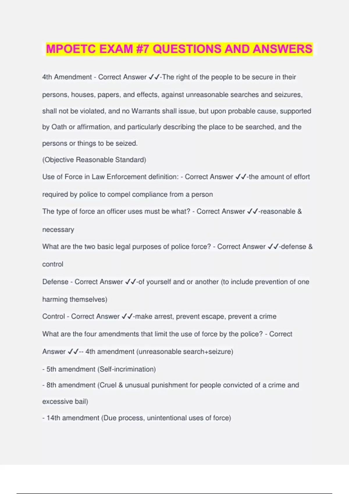 MPOETC EXAM #7 QUESTIONS AND ANSWERS 4th Amendment - Correct Answer ️️ -The right of the people to be secure in their persons, houses, papers, and effects, against unreasonable searches and seizures, shall not be violated, and no Warrants shall issue, but upon probable cause, supported by Oath or affirmation, and particularly describing the place to be searched, and the persons or things to be seized. (Objective Reasonable Standard) Use of Force in Law Enforcement definition: - Correct Answer ️️ -the amount of effort required by police to compel compliance from a person The type of force an officer uses must be what? - Correct Answer ️️ -reasonable & necessary What are the two basic legal purposes of police force? - Correct Answer ️️ -defense & control Defense - Correct Answer ️️ -of yourself and or another (to include prevention of one harming themselves) Control - Correct Answer ️️ -make arrest, prevent escape, prevent a crime What are the four amendments that limit the use of force by the police? - Correct Answer ️️ -- 4th amendment (unreasonable search+seizure) - 5th amendment (Self-incrimination) - 8th amendment (Cruel & unusual punishment for people convicted of a crime and excessive bail) - 14th amendment (Due process, unintentional uses of force) Title 42, Section 1983 - Correct Answer ️️ -civil action for the deprivation of one's civil rights (acting under "Color of Law" or "Cloak of Authority")when identifying as a police officer you are acting under "Color of Law" Remedies available in a Section 1983 claim - Correct Answer ️️ -- injunctive relief - compensatory damages - punitive damages - attorney fees awarded to the prevailing lawyer Injunctive Relief - Correct Answer ️️ -remedy provided by a court decision preventing or requiring someone to perform a particular action. Compensatory Damages - Correct Answer ️️ -A monetary award equivalent to the actual value of injuries or damage sustained by the aggrieved party (ex. medical bills) Punitive Damages - Correct Answer ️️ -a monetary amount awarded to a plaintiff in a civil lawsuit for the purpose of punishing the defendant, or to deter him from engaging in the same conduct in the future ("don't do it again") When an officer violates use of force standards, who faces negative consequences from the incident? - Correct Answer ️️ -Everyone does; officer, department & the community What are consequences for violating use of force standards? - Correct Answer ️️ -- incident investigation - complaint - discipline - loss employment/ career - civil lawsuit - criminal prosecution/ incarceration - loss of legitimacy in community Who may suits be brought against? - Correct Answer ️️ -- officer