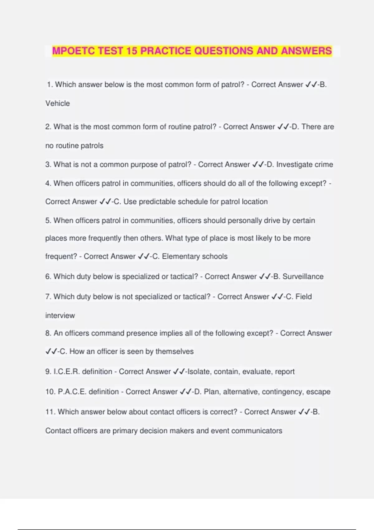 MPOETC TEST 15 PRACTICE QUESTIONS AND ANSWERS 1. Which answer below is the most common form of patrol? - Correct Answer ️️ -B. Vehicle 2. What is the most common form of routine patrol? - Correct Answer ️️ -D. There are no routine patrols 3. What is not a common purpose of patrol? - Correct Answer ️️ -D. Investigate crime 4. When officers patrol in communities, officers should do all of the following except? - Correct Answer ️️ -C. Use predictable schedule for patrol location 5. When officers patrol in communities, officers should personally drive by certain places more frequently then others. What type of place is most likely to be more frequent? - Correct Answer ️️ -C. Elementary schools 6. Which duty below is specialized or tactical? - Correct Answer ️️ -B. Surveillance 7. Which duty below is not specialized or tactical? - Correct Answer ️️ -C. Field interview 8. An officers command presence implies all of the following except? - Correct Answer ️️ -C. How an officer is seen by themselves 9. I.C.E.R. definition - Correct Answer ️️ -Isolate, contain, evaluate, report 10. P.A.C.E. definition - Correct Answer ️️ -D. Plan, alternative, contingency, escape 11. Which answer below about contact officers is correct? - Correct Answer ️️ -B. Contact officers are primary decision makers and event communicators 12. Officer Brickley and Officer Sullivan respond to a domestic dispute, Brickley is the cover officer, Brickley should do all of the following except? - Correct Answer ️️ -B. Interview subjects 13. What shape below best describes positioning needed between contact and cover officers? - Correct Answer ️️ -C. Triangle 14. What action below in itself is more likely to increase officers chances for survival in deadly force encounters? - Correct Answer ️️ -B. Moving immediately 15. At 1:15 AM Officers Evans and Peterson respond to an armed home