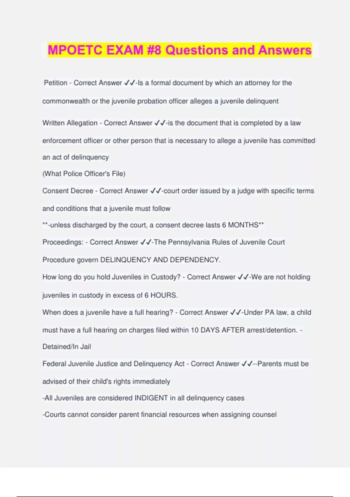 MPOETC EXAM #8 Questions and Answers Petition - Correct Answer ️️ -Is a formal document by which an attorney for the commonwealth or the juvenile probation officer alleges a juvenile delinquent Written Allegation - Correct Answer ️️ -is the document that is completed by a law enforcement officer or other person that is necessary to allege a juvenile has committed an act of delinquency (What Police Officer's File) Consent Decree - Correct Answer ️️ -court order issued by a judge with specific terms and conditions that a juvenile must follow **-unless discharged by the court, a consent decree lasts 6 MONTHS** Proceedings: - Correct Answer ️️ -The Pennsylvania Rules of Juvenile Court Procedure govern DELINQUENCY AND DEPENDENCY. How long do you hold Juveniles in Custody? - Correct Answer ️️ -We are not holding juveniles in custody in excess of 6 HOURS. When does a juvenile have a full hearing? - Correct Answer ️️ -Under PA law, a child must have a full hearing on charges filed within 10 DAYS AFTER arres