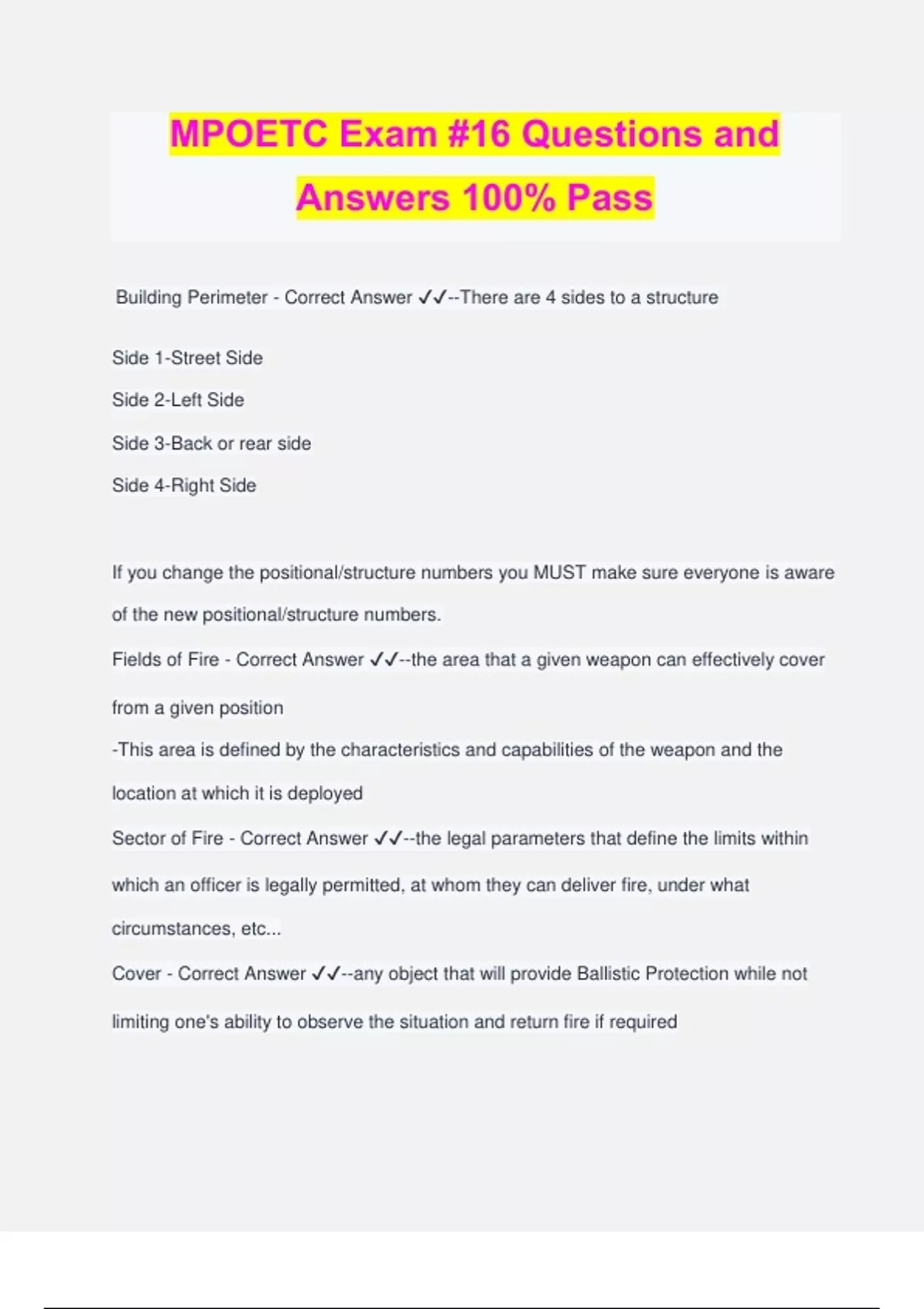 MPOETC Exam #16 Questions and Answers 100% Pass Building Perimeter - Correct Answer ️️ --There are 4 sides to a structure Side 1-Street Side Side 2-Left Side Side 3-Back or rear side Side 4-Right Side If you change the positional/structure numbers you MUST make sure everyone is aware of the new positional/structure numbers. Fields of Fire - Correct Answer ️️ --the area that a given weapon can effectively cover from a given position -This area is defined by the characteristics and capabilities of the weapon and the location at which it is deployed Sector of Fire - Correct Answer ️️ --the legal parameters that define the limits within which an officer is legally permitted, at whom they can deliver fire, under what circumstances, etc... Cover - Correct Answer ️️ --any object that will provide Ballistic Protection while not limiting one's ability to observe the situation and return fire if required Concealment - Correct Answer ️️ --Any object or group of objects that creates a visual barrier between you and a threat but may not stop a projectile Officer Decision Making Criteria - Correct Answer ️️ --Legal -Tactical -Public Safety -Self-Preservation Issues Police Officers strive to make decisions that are LEGALLY DEFENSIBLE Priority of life scale - Correct Answer ️️ -1. Hostages/Victims 2. Innocent By-Standers 3. First Responders 4. Suspect/Subjects 5. Property/Evidence Dynamic Search - Correct Answer ️️ --a search is conducted during a hostile, ongoing threat environment and seek to quickly clear pertinent areas in an effort to locate and neutralize an ongoing threat EX: Active Shooter Methodic Search - Correct Answer ️️ -A search is conducted much more thoroughly and slowly. This type of search may be used when finding an unsecured residence, attempt to locate an intruder EX: Burglary Complying Suspect - Correct Answer ️️ --Do NOT confront alone, if possible -Have suspect move away from doorway to avoid hostage/barricade situation -Be aware of additional suspects who may not comply -Challenge from cover Robbery Alarms Approach - Correct Answer ️️ --Arrive using invisible deployment -Notify dispatch of location & further info -Don't park in front of building -View the whole scene for dangerous situations -Secure area and eliminate escape routes Bank Alarm Approach - Correct Answer ️️ --Try to determine the specific activation point -Advise dispatch of arrival -Watch for lookouts -Cover exits at a safe distance -Canvas area for possible actors -When back up arrives attempt to get visual of interior -If "normal" enter cautiously with officer safety in mind -If "in progress" notify dispatch & set up perimeter**don't enter bank alone Burglary Approach - Correct Answer ️️ --utilize silent deploy