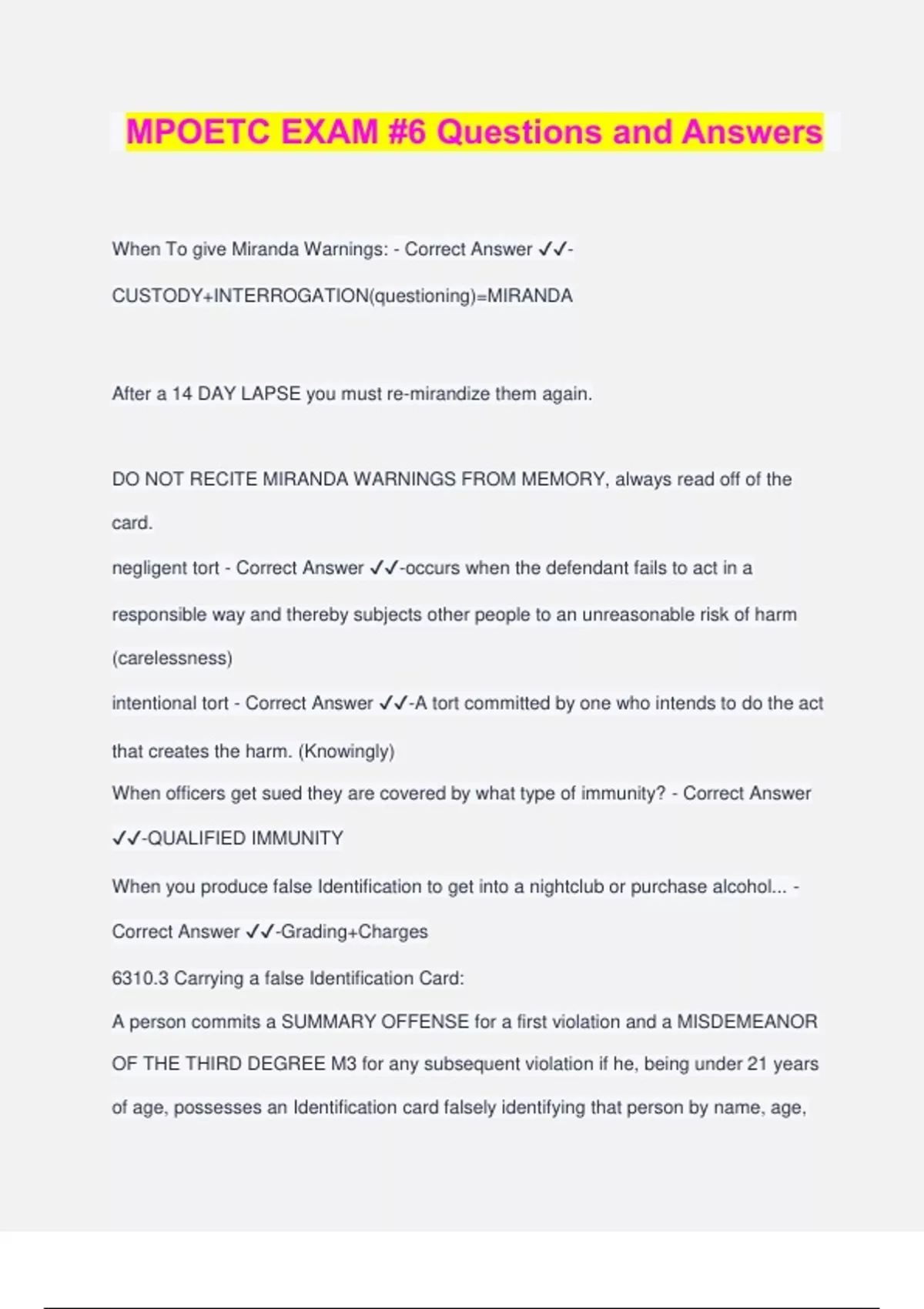 MPOETC EXAM #6 Questions and Answers When To give Miranda Warnings: - Correct Answer ️️ - CUSTODY+INTERROGATION(questioning)=MIRANDA After a 14 DAY LAPSE you must re-mirandize them again. DO NOT RECITE MIRANDA WARNINGS FROM MEMORY, always read off of the card. negligent tort - Correct Answer ️️ -occurs when the defendant fails to act in a responsible way and thereby subjects other people to an unreasonable risk of harm (carelessness) intentional tort - Correct Answer ️️ -A tort committed by one who intends to do the act that creates the harm. (Knowingly) When officers get sued they are covered by what type of immunity? - Correct Answer ️️ -QUALIFIED IMMUNITY When you produce false Identification to get into a nightclub or purchase alcohol... - Correct Answer ️️ -Grading+Charges 6310.3 Carrying a false Identification Card: A person commits a SUMMARY OFFENSE for a first violation and a MISDEMEANOR OF THE THIRD DEGREE M3 for any subsequent violation if he, being under 21 years of age, possesses an Identification card falsely identifying that person by n