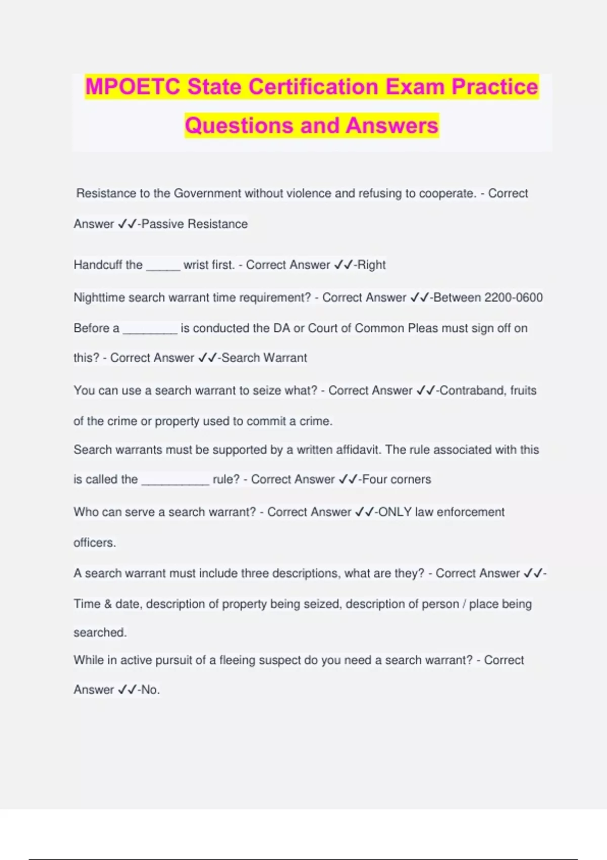 MPOETC State Certification Exam Practice Questions and Answers Resistance to the Government without violence and refusing to cooperate. - Correct Answer ️️ -Passive Resistance Handcuff the _____ wrist first. - Correct Answer ️️ -Right Nighttime search warrant time requirement? - Correct Answer ️️ -Between Before a ________ is conducted the DA or Court of Common Pleas must sign off on this? - Correct Answer ️️ -Search Warrant You can use a search warrant to seize what? - Correct Answer ️️ -Contraband, fruits of the crime or property used to commit a crime. Search warrants must be supported by a written affidavit. The rule associated with this is called the __________ rule? - Correct Answer ️️ -Four corners Who can serve a search warrant? - Correct Answer ️️ -ONLY law enforcement officers. A search warrant must include three descriptions, what are they? - Correct Answer ️️ - Time & date, description of property being seized, description of person / place being searched. While in active pursuit of a fleeing suspect do you need a search warrant? - Correct Answer ️️ -No. When attempting to search a vehicle, you must ask the driver what? - Correct Answer ️️ -Consent to search the car. While searching the vehicle you're allowed to look where? - Correct Answer ️️ -Within the drivers "wingspan." Never in the trunk. When an Officer stops and speaks with someone spontaneously it's called? - Correct Answer ️️ -Mere encounter An Officer tells a person they're NOT free to leave but NOT in custody - Correct Answer ️️ -Investigatory detention An Officer _______ _________ that criminal activity is afoot. - Correct Answer ️️ - Reasonable suspicion Notice of a lawsuit is called? - Correct Answer ️️ -Summons Court order requiring person to appear in court - Correct Answer ️️ -subpoena Facts and circumstances surrounding a specific person that would lead a prudent person to believe that a crime was committed - Correct Answer ️️ -Probable Cause Mapp Vs. Ohio case law deals with what? - Correct Answer ️️ -Exclusionary Act. All evidence discovered as a result of a search and seizure conducted in violation of the Fourth Amendment of the United States Constitution ("Constitution") shall be inadmissible in State court proceedings. Necessary to prevent the escape of a fleeing felon and suspect poses a threat to the officer, if feasible, given a verbal warning is apart of what case l