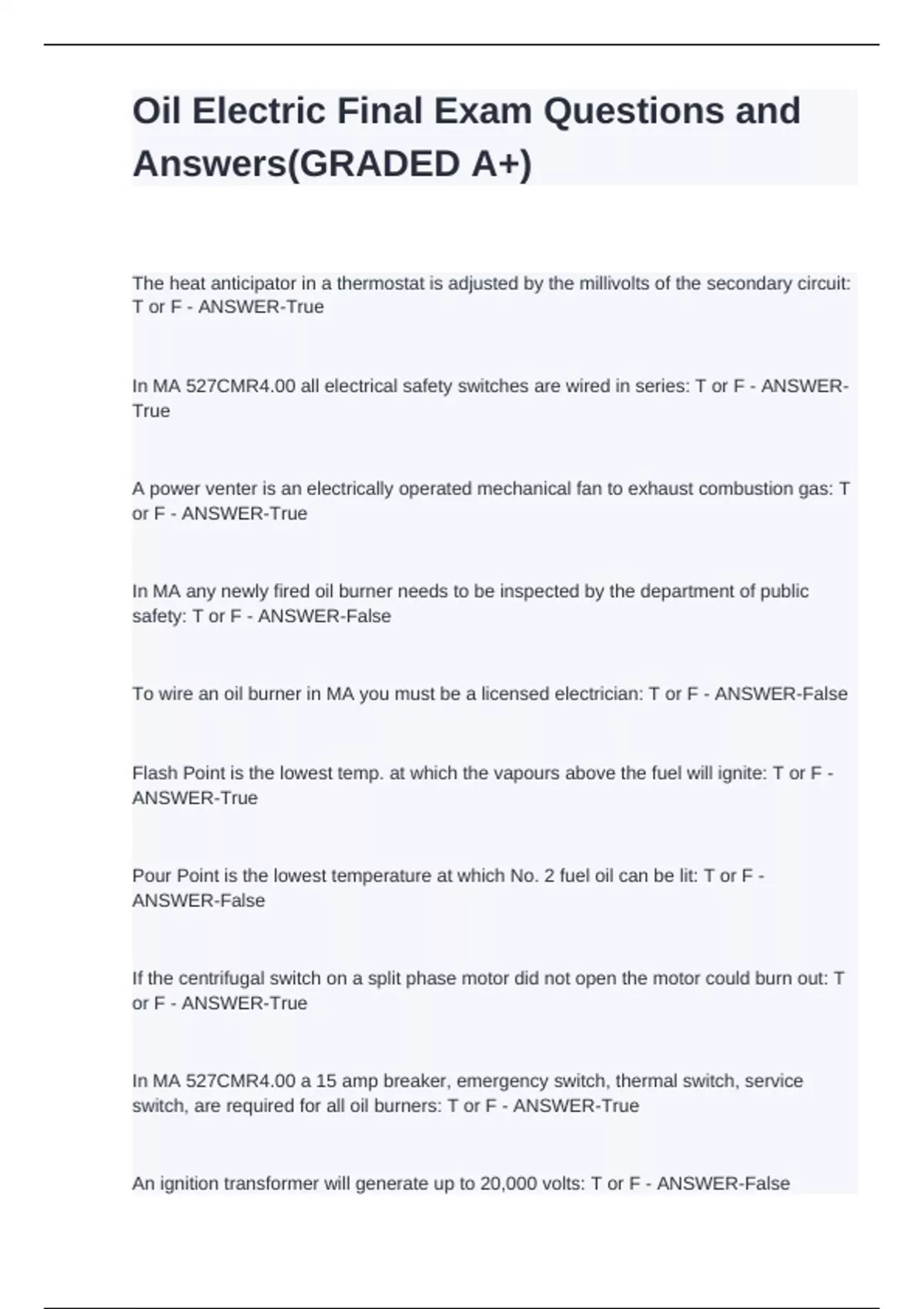 To wire an oil burner in MA you must be a licensed electrician: T or F - ANSWER-False Flash Point is the lowest temp. at which the vapours above the fuel will ignite: T or F - ANSWER-True Pour Point is the lowest temperature at which No. 2 fuel oil can be lit: T or F - ANSWER-False If the centrifugal switch on a split phase motor did not open the motor could burn out: T or F - ANSWER-True In MA 527CMR4.00 a 15 amp breaker, emergency switch, thermal switch, service switch, are required for all oil burners: T or F - ANSWER-True An ignition transformer will generate up to 20,000 volts: T or F - ANSWER-False A cad cell is a device that: A) Senses heat in the flue B) Senses light in the flue C) Senses heat in the combustion chamber D) Senses light in the the combustion chamber - ANSWER-D) Senses light in the combustion chamber What is the function of a limit switch for an oil furnace: A) N.O. Safety Switch B) N.C. Operational Switch C) N.C. Safety Switch D) N.O. Safety Switch - ANSWER-C) N.C. Safety Switch